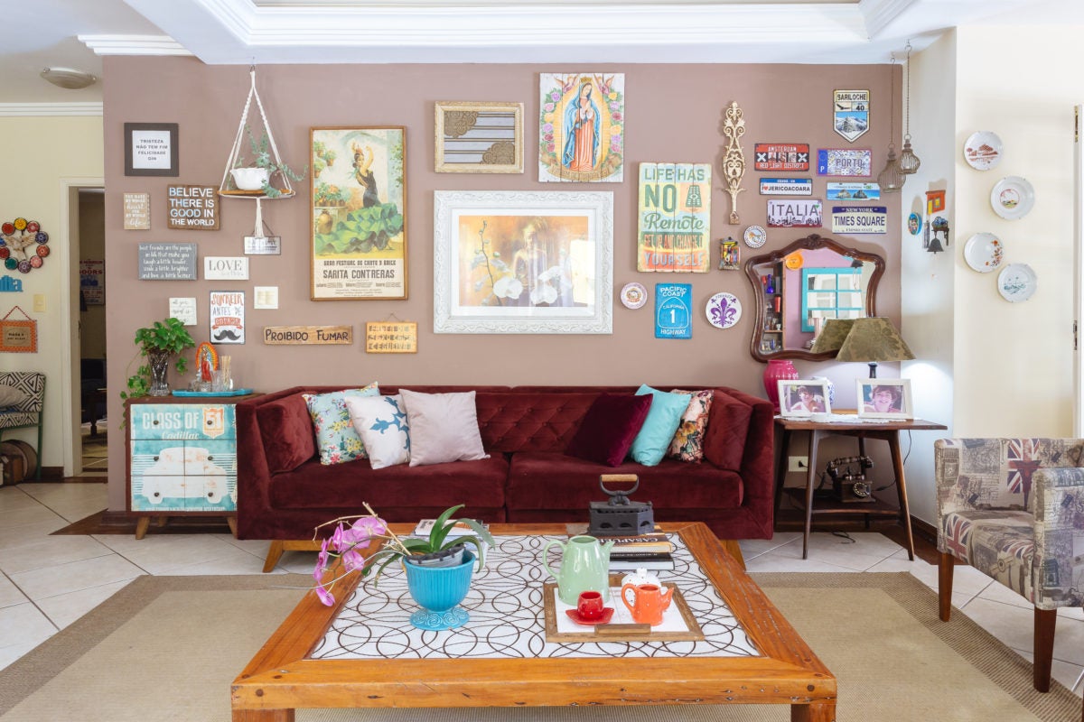 Uma mistura de móveis restaurados e antiguidades com peças modernas, pinceladas de lembranças de passeios e viagens, objetos de familiares e muitas memórias afetivas.