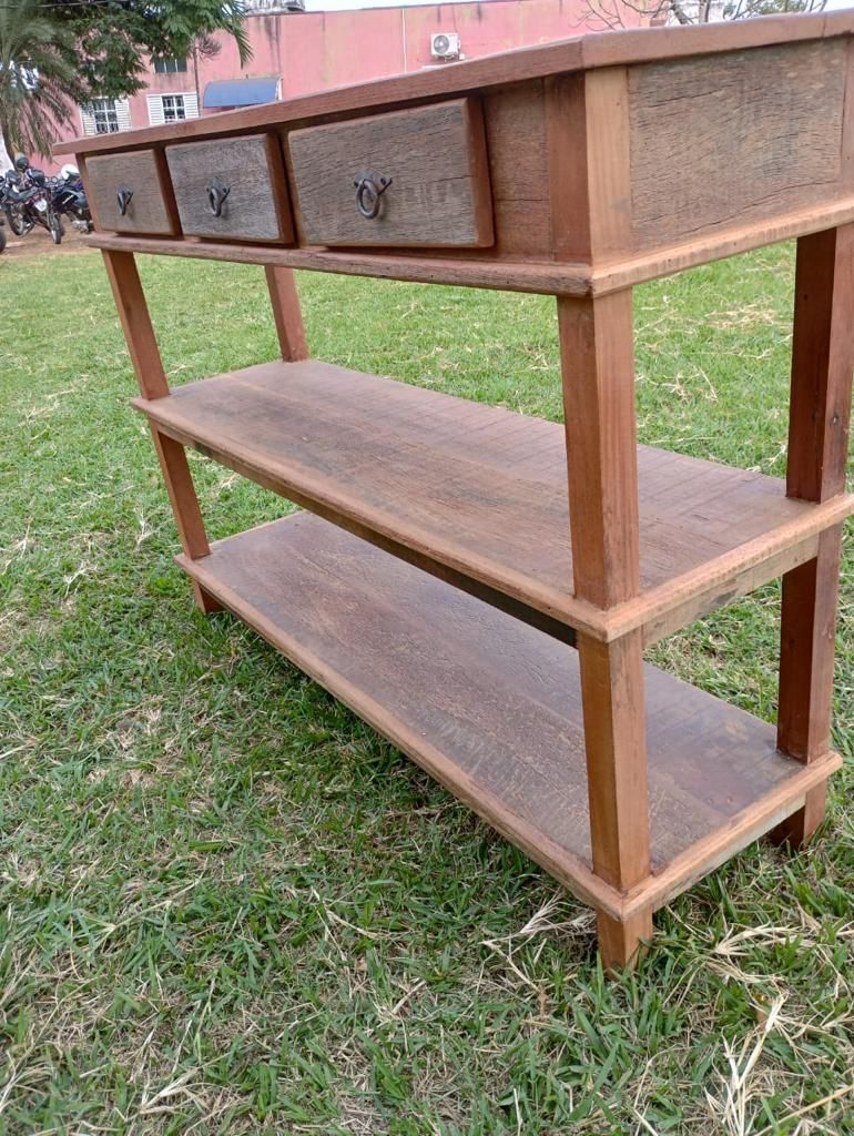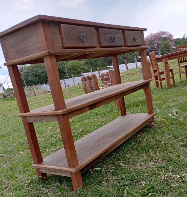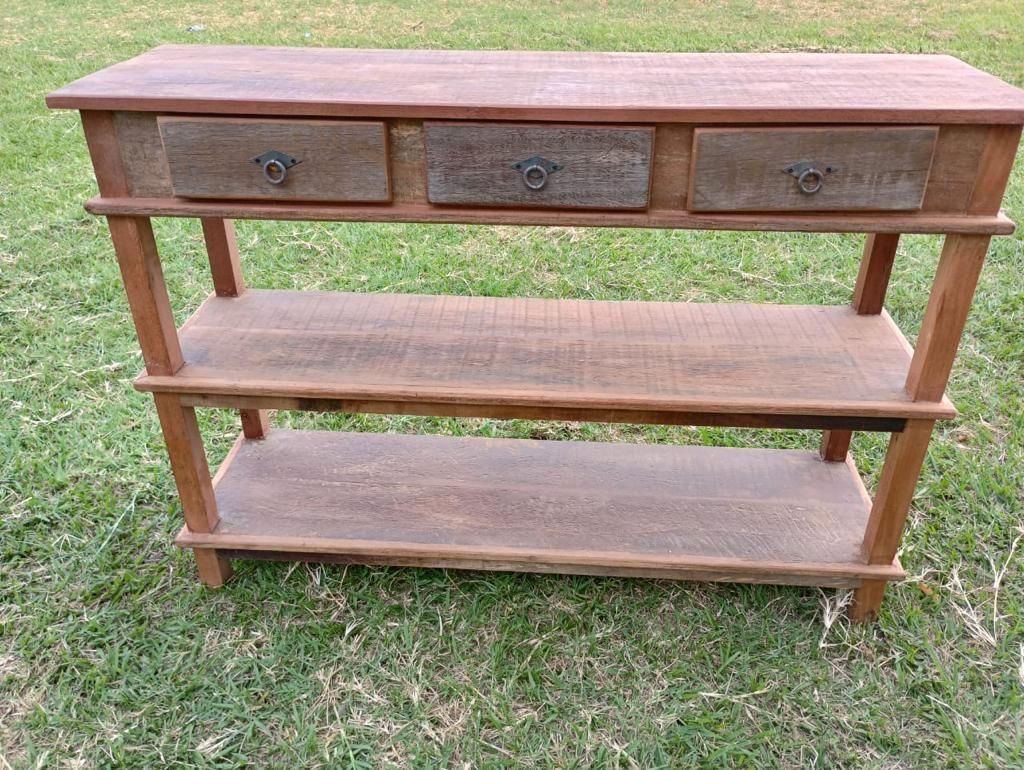 Peça feita com madeira de demolição, sem acabamento. Possui 3 gavetas e 2 prateleiras com puxadores.