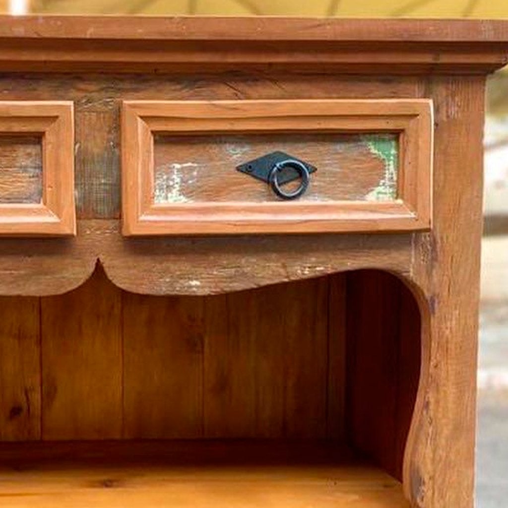 Peça feita com madeira de demolição. Possui 2 gavetas com puxadores de ferro e 2 prateleiras internas na parte inferior.