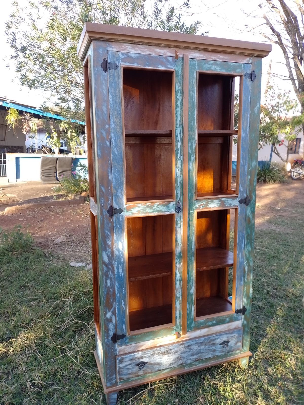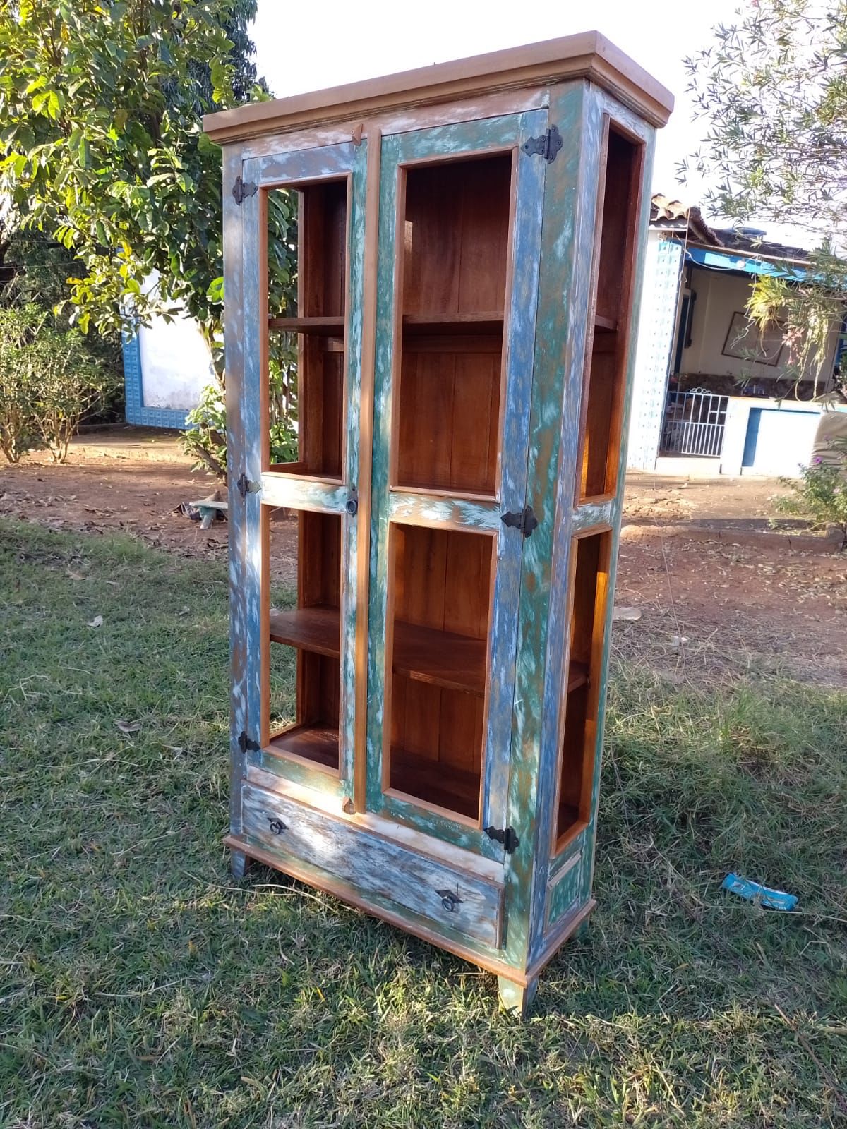 Peça feita com madeira de demolição, sem acabamento, com pintura azul patinada. Possui portas sem vidros, 3 prateleiras internas e 1 gaveta na base.