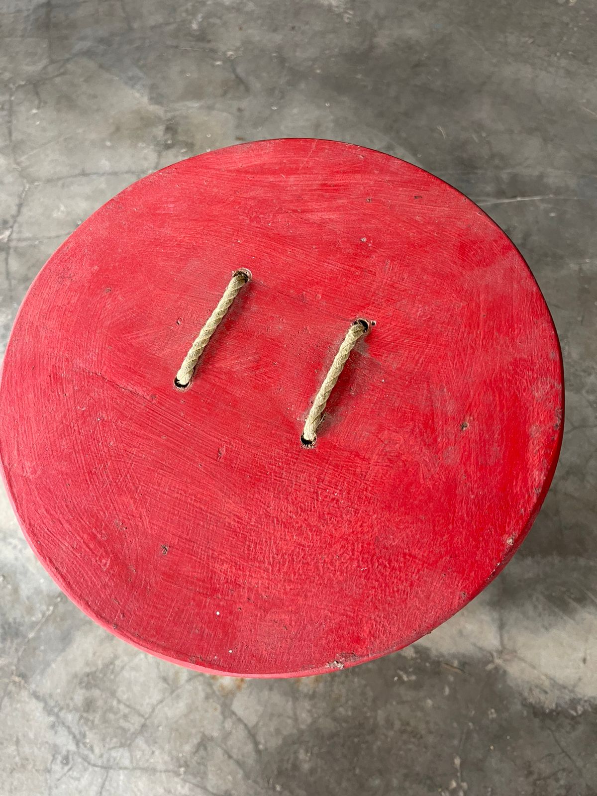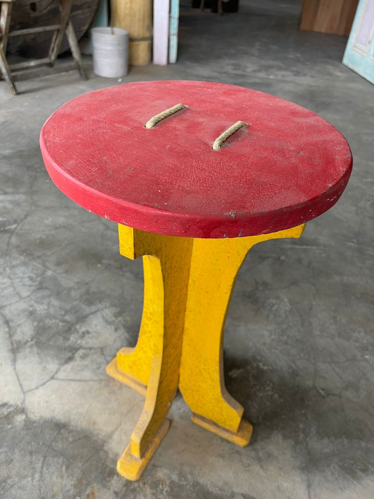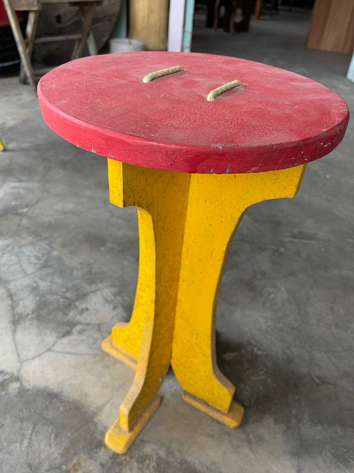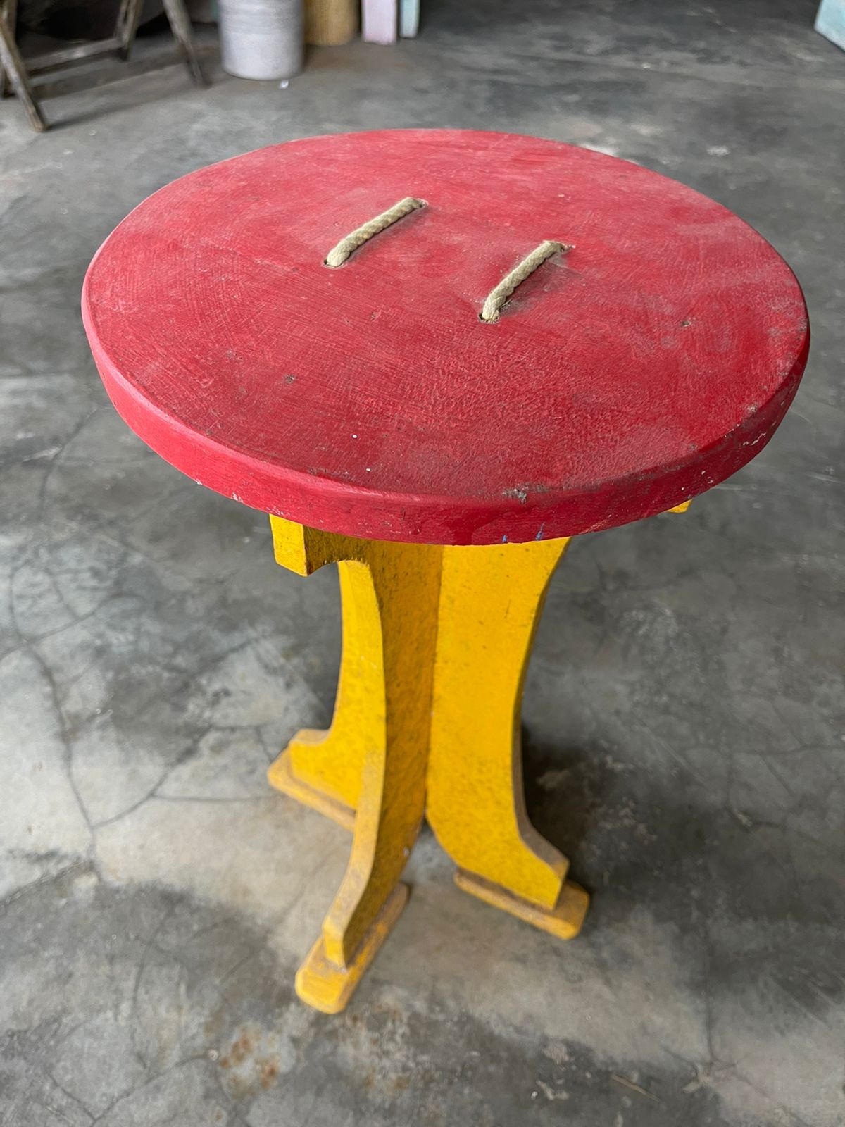 Banqueta de madeira com o assento pintado na cor vermelha e a base pintado de amarelo.