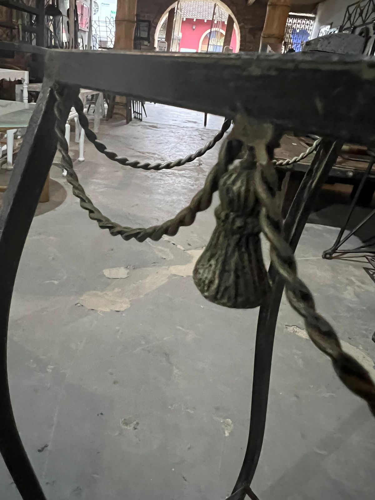 Feita em ferro, sem acabamento, com pernas onduladas. Possui ornamentos na parte superior e grade na parte inferior.