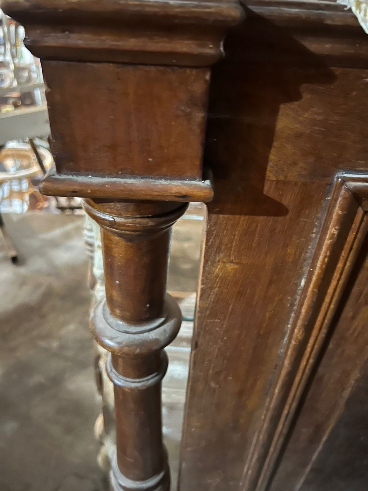 Feita de madeira maciça, com detalhes entalhados e pés torneados.