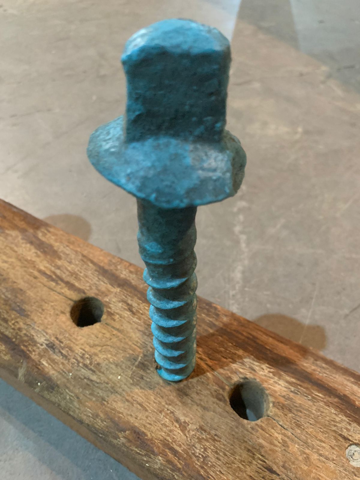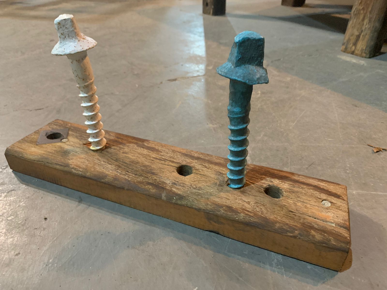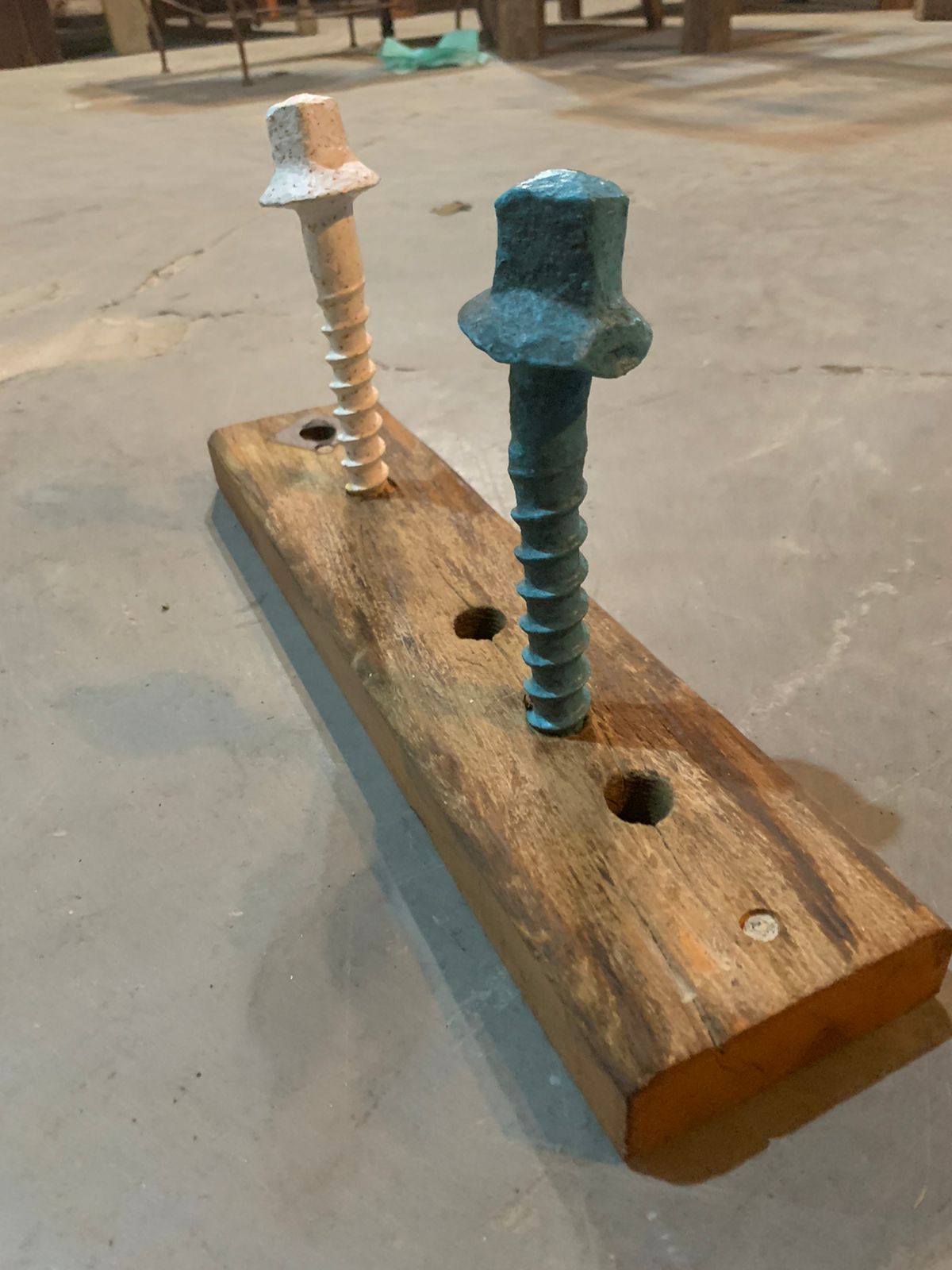 Ideal para ambientes com inspiração rústica, já que a combinação da base de madeira de cruzeta e 2 parafusos antigos de ferro, retirados de um trem antigo, se transformam em um lindo cabideiro.