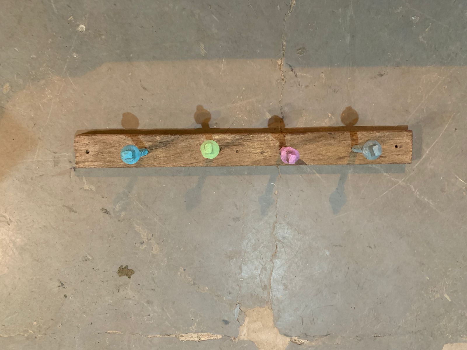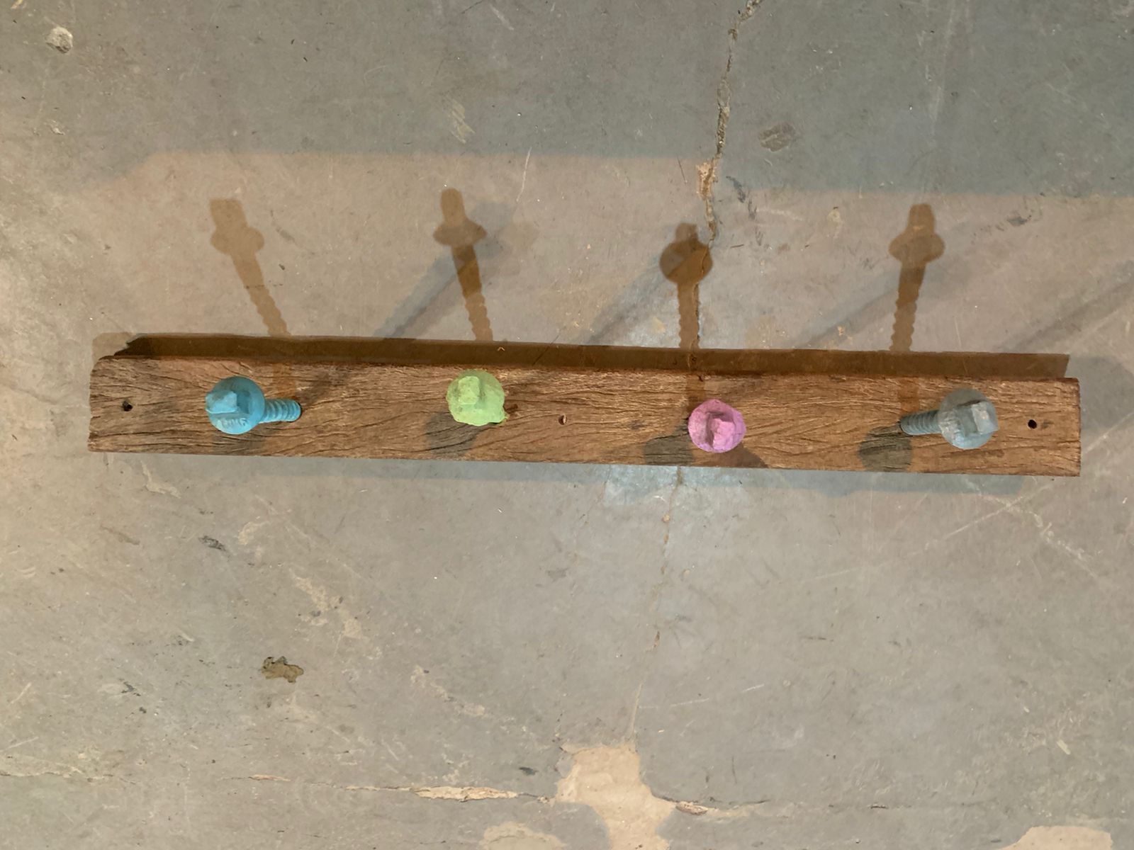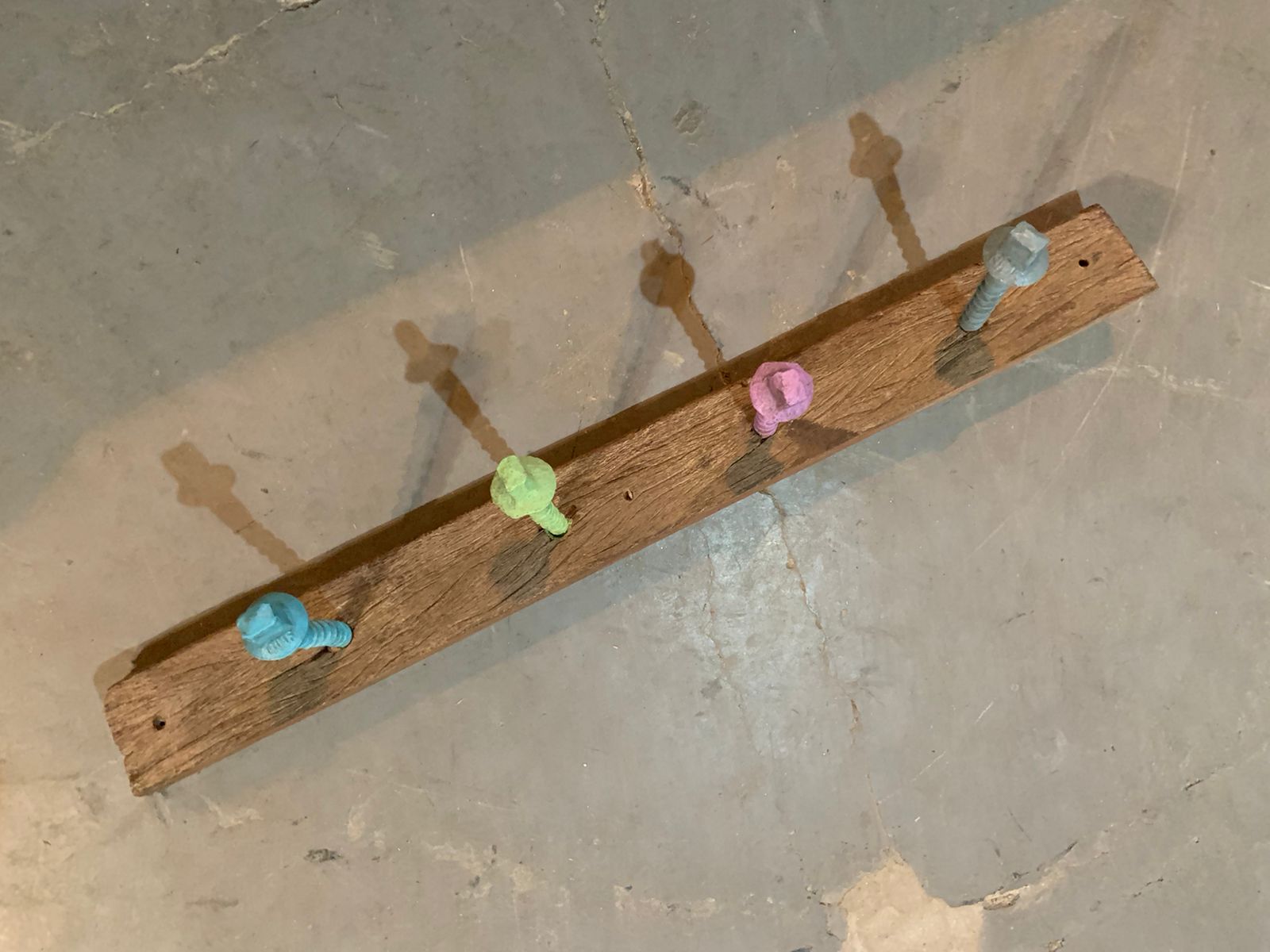 Ideal para ambientes com inspiração rústica, já que a combinação da base de madeira de cruzeta e 4 parafusos antigos de ferro, retirados de trem antigo, se transformam em um lindo cabideiro.