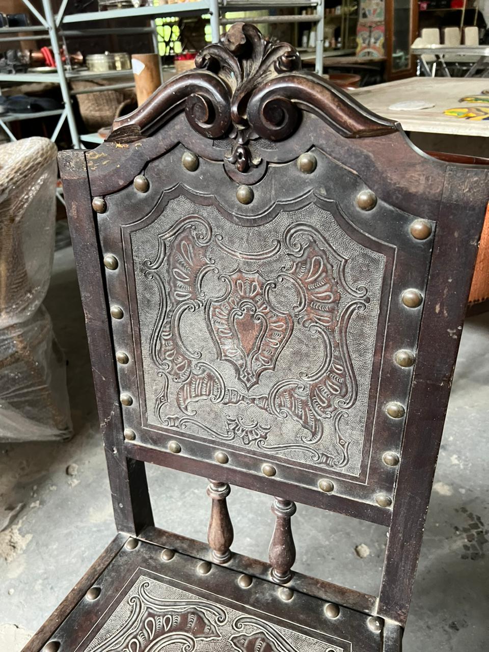 Feita de madeira nobre torneada, com assento e encosto de couro trabalhado preso com tachas.