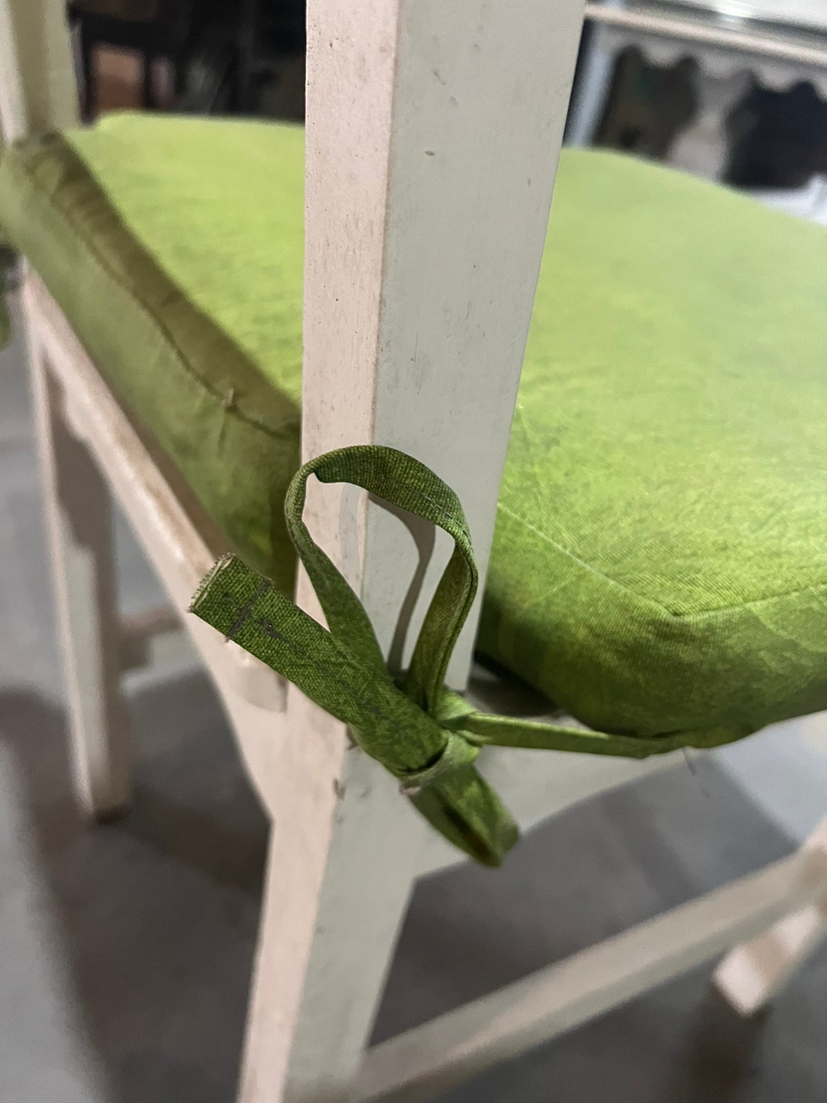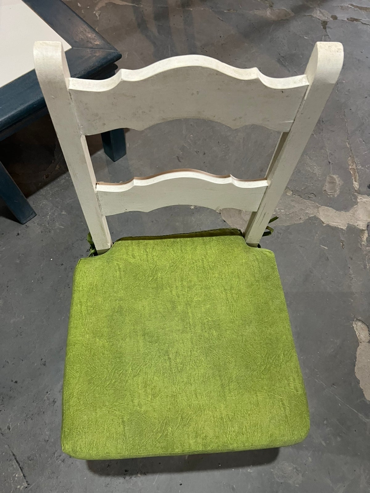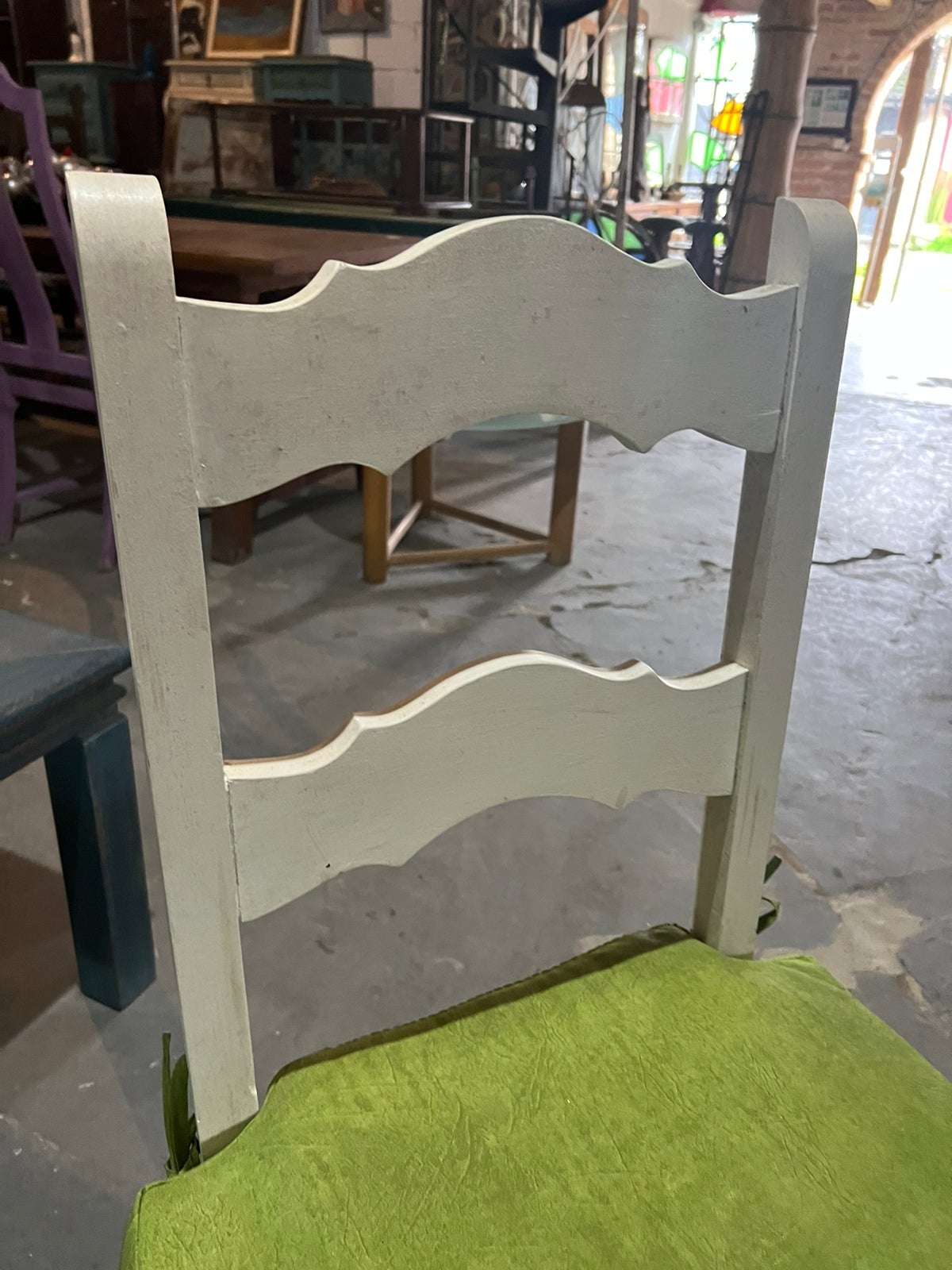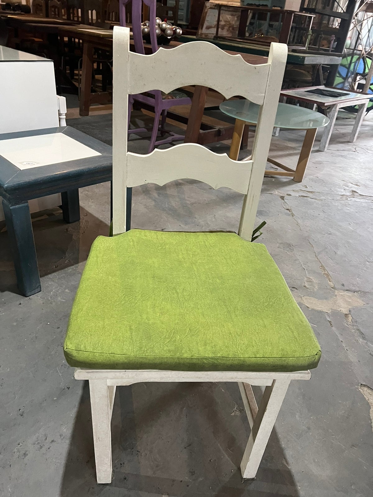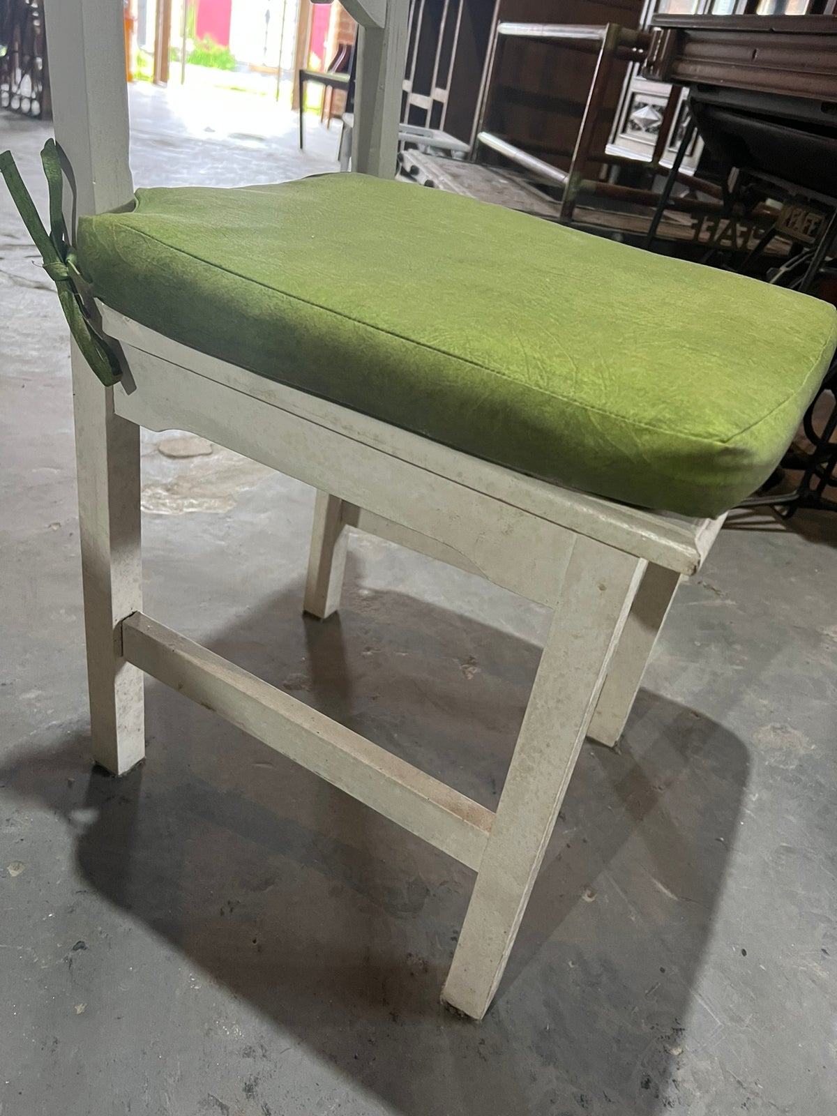Feito de madeira maciça, sem acabamento, pintado de branco. Possui assento estofado em verde.