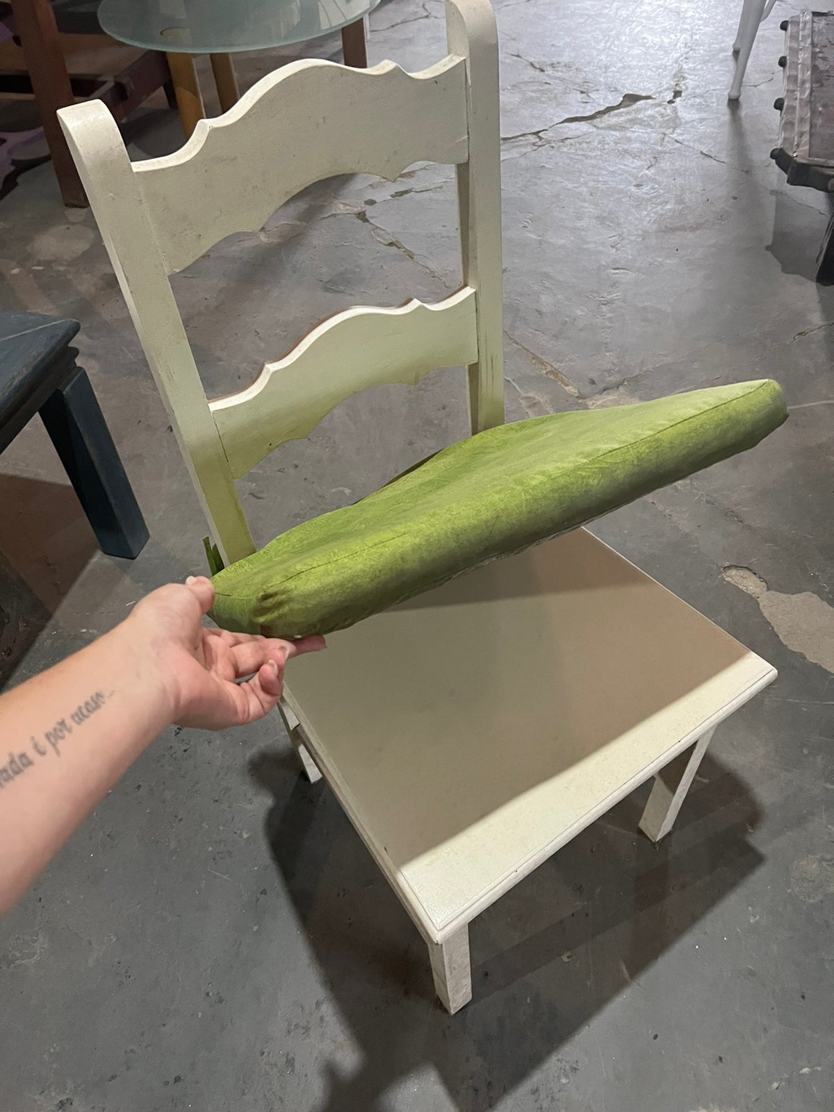 Cadeira de madeira com assento verde.