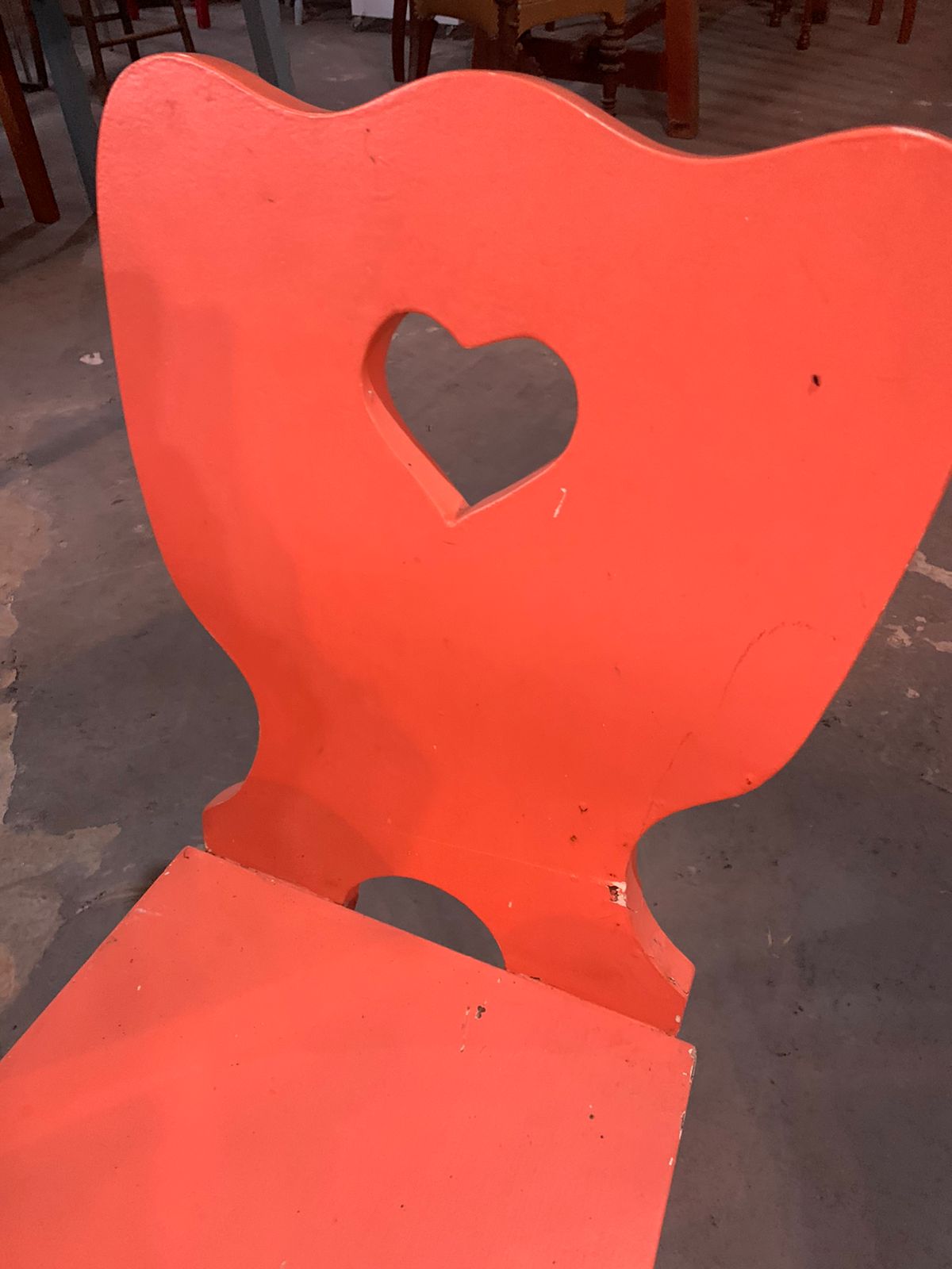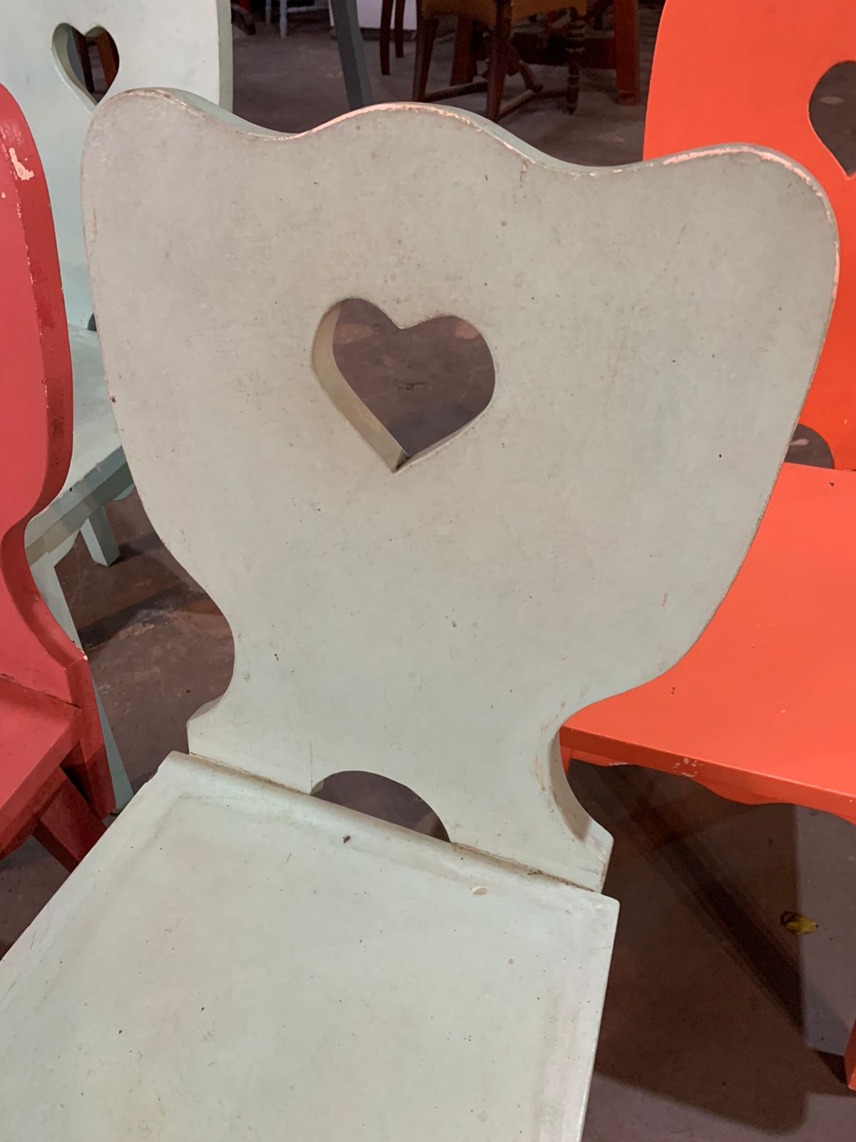 Cadeiras de madeira coloridas brancas e avermelhadas, com coração!