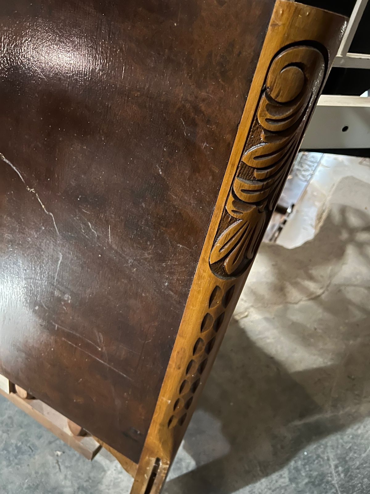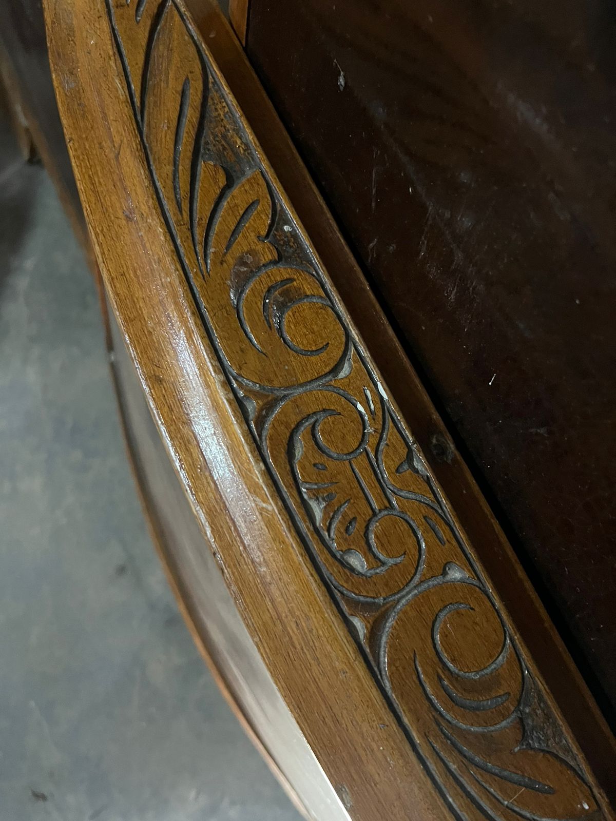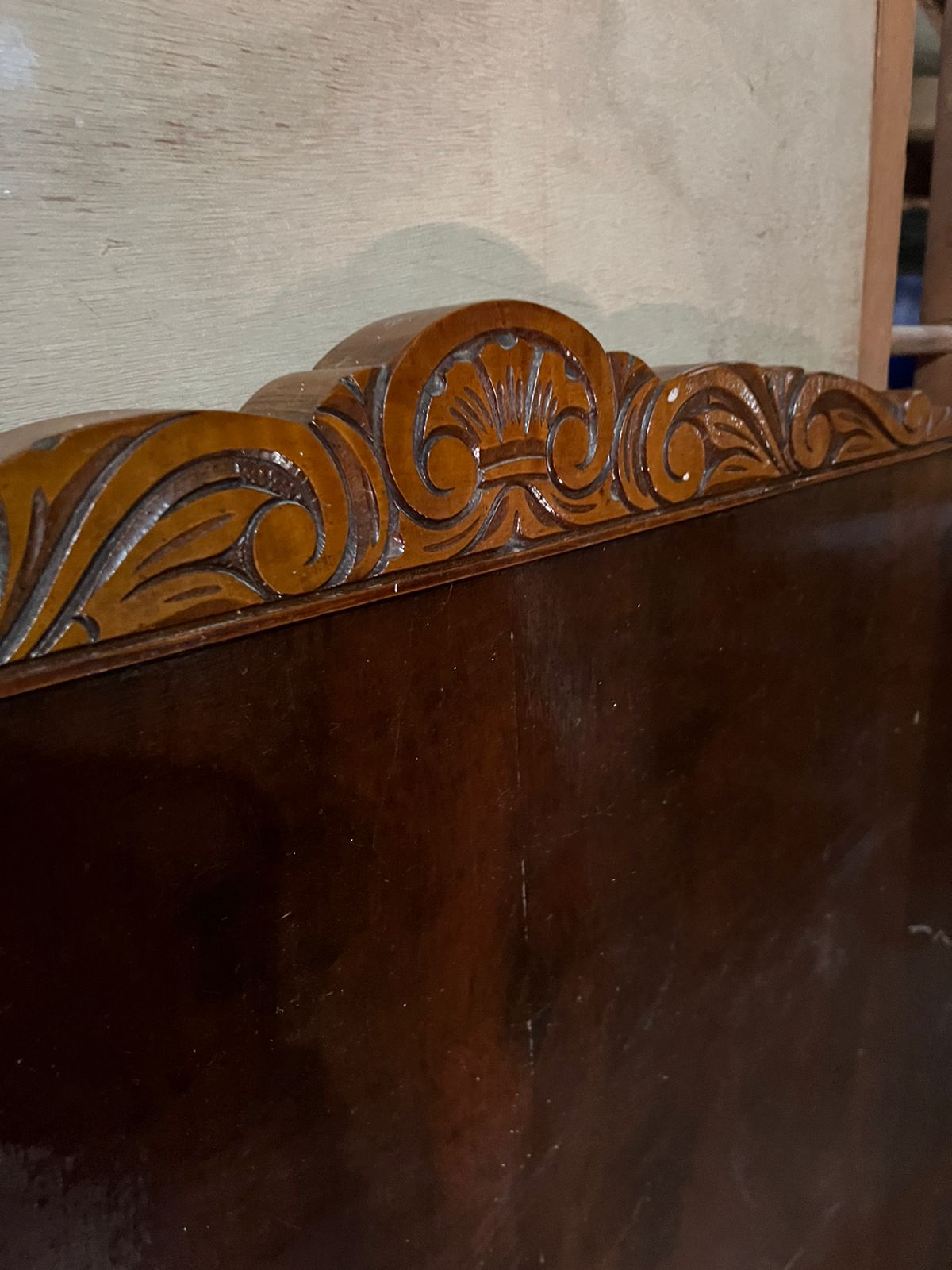 Feita de madeira maciça, em bom estado. Possui detalhes de entalhes estilo provençal, com peseira e estrado.