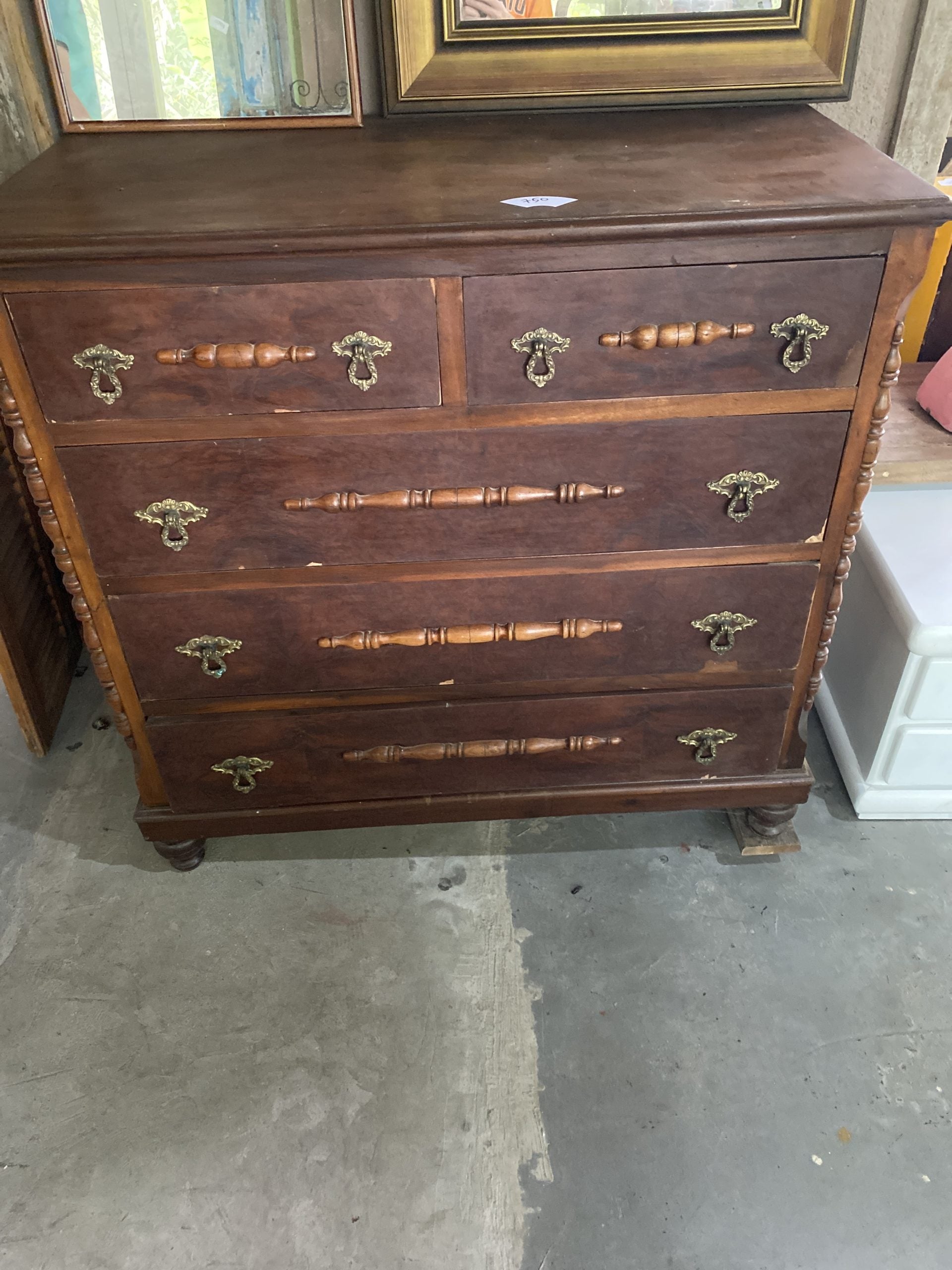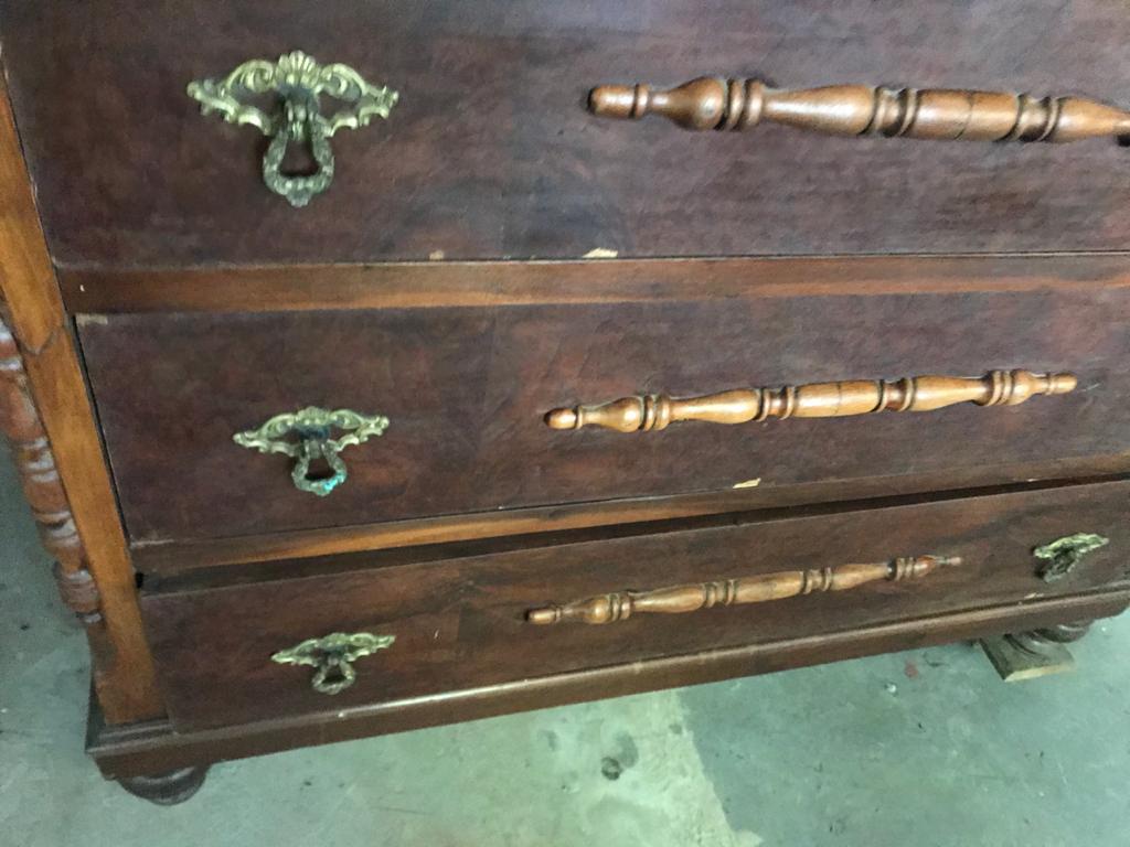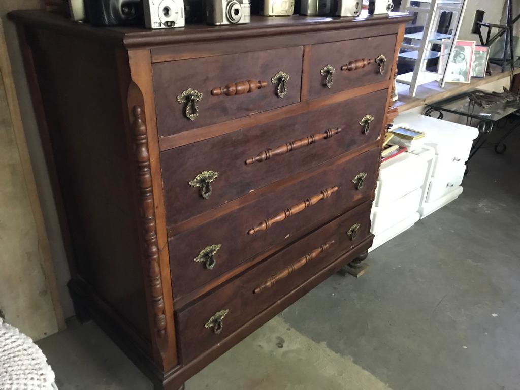 Cômoda de madeira Imbuia com cinco gavetas.