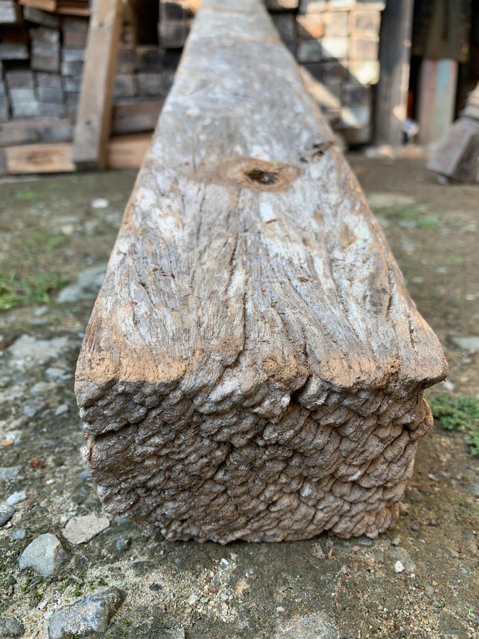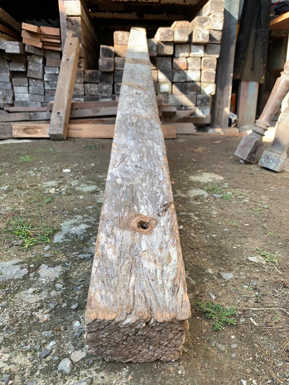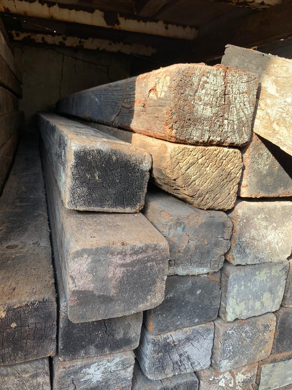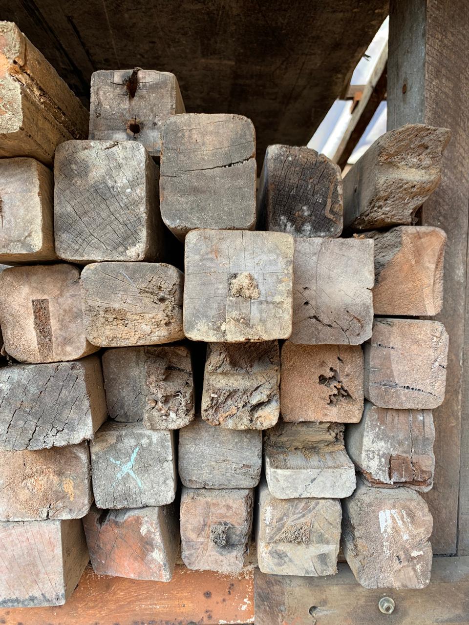 Madeiras usadas em postes de luz antigos. Possuem furos de pregos na sua extensão.