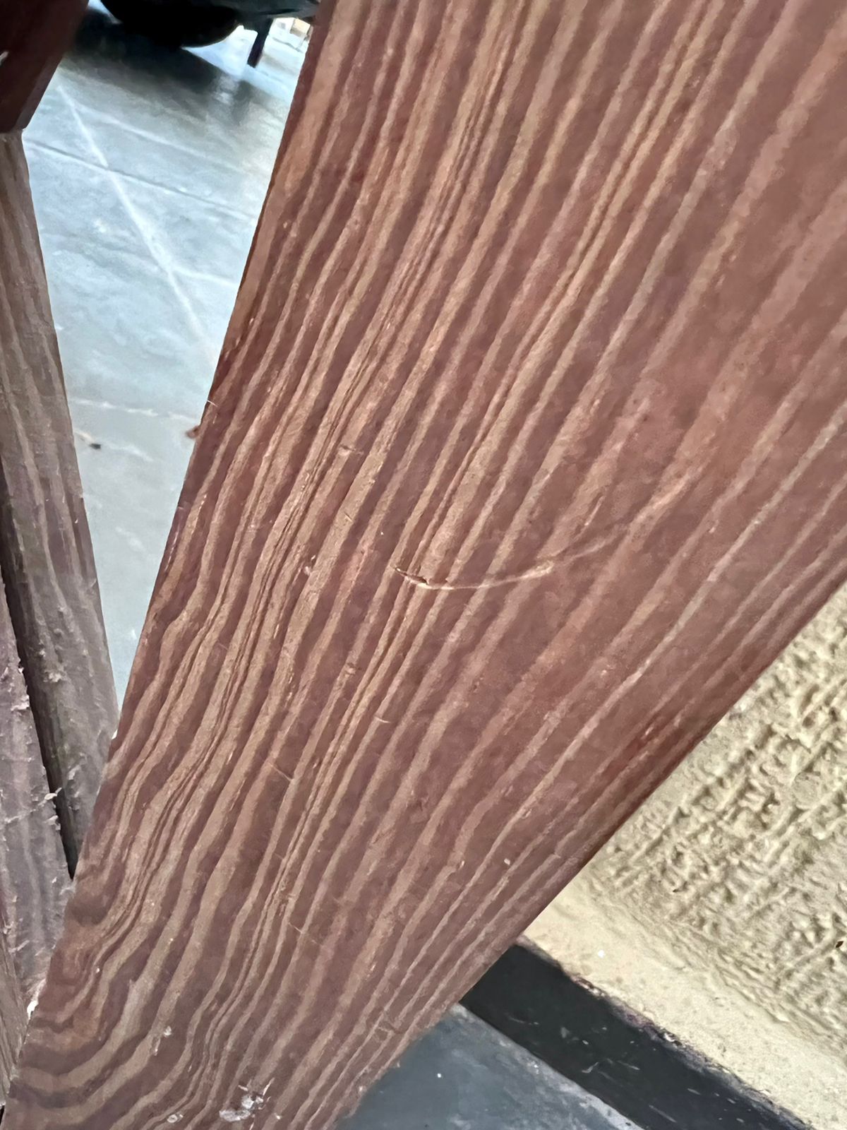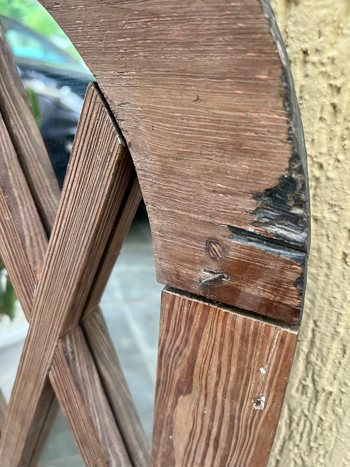 Possui detalhes na madeira, por ser uma peça feita com material de demolição.