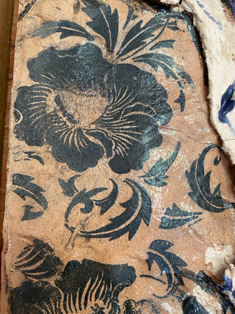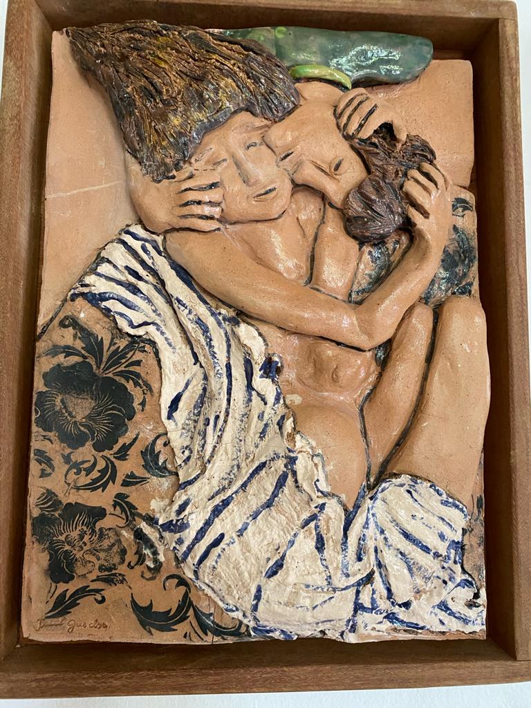 Escultura e pintura com moldura de madeira.