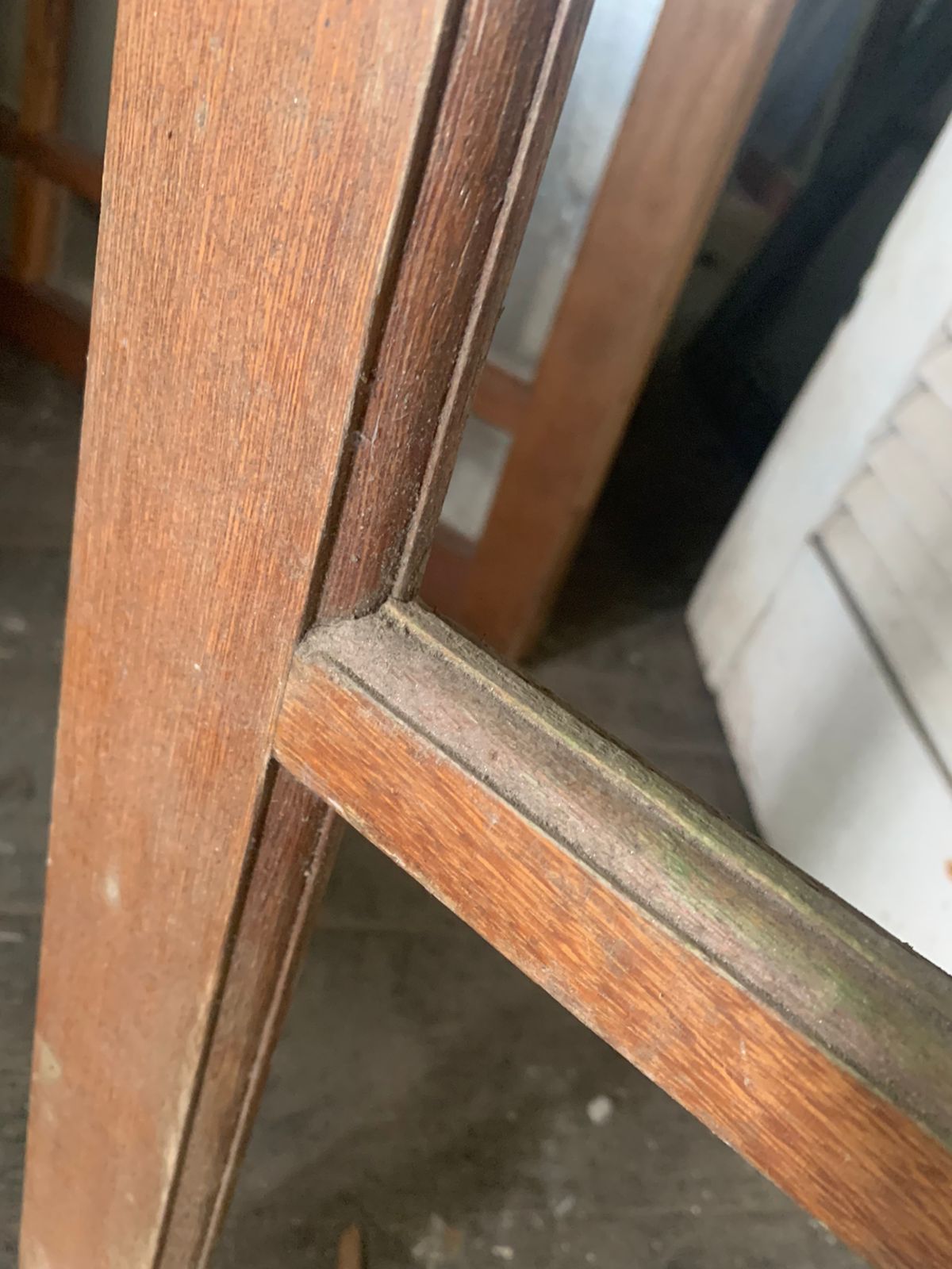 De madeira maciça, com espaços que podem ser colocados vidros ou espelhos.