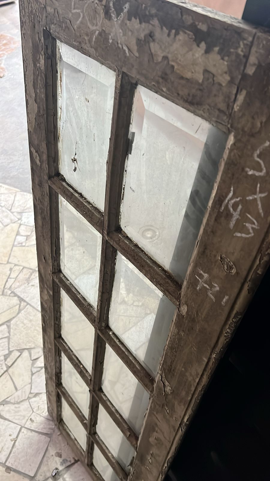 Feita de madeira maciça, peça de demolição, sem acabamento. Possui vidros bisote.