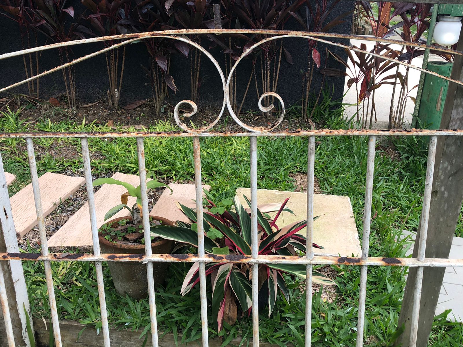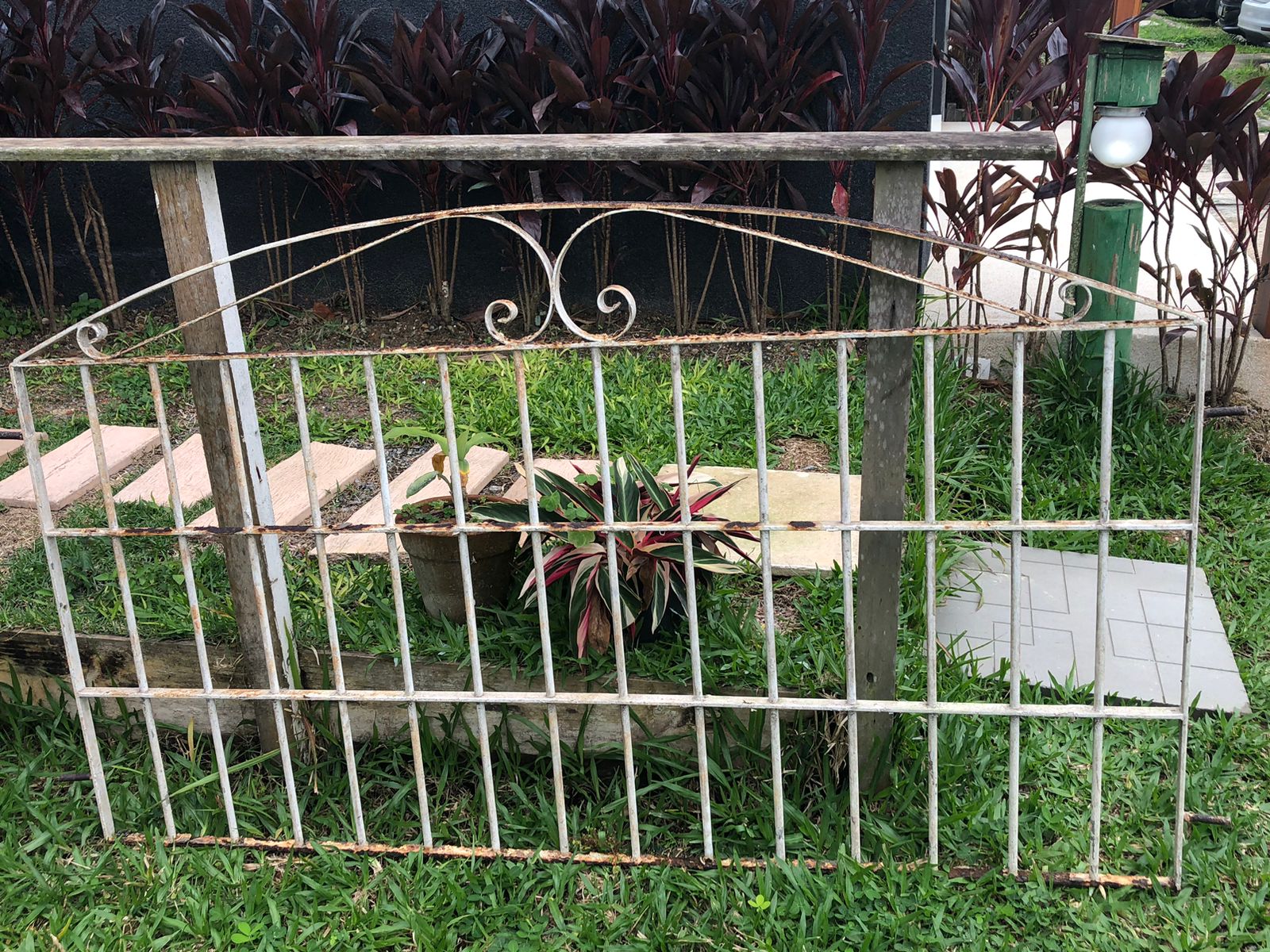 Grade de ferro fundido branca de demolição, modelo horizontal comprido, com topo em semi-arco e detalhes ornamentados.