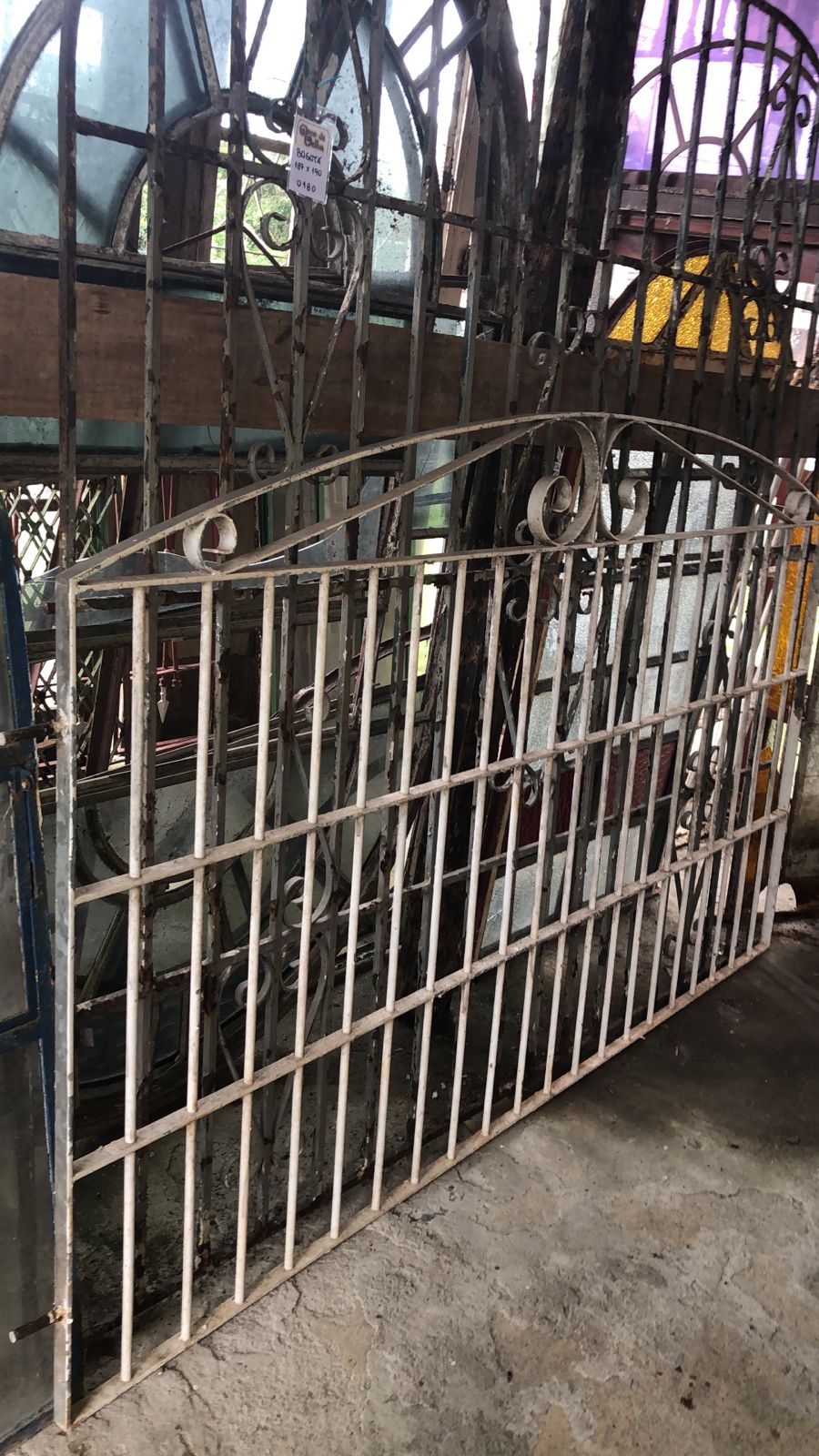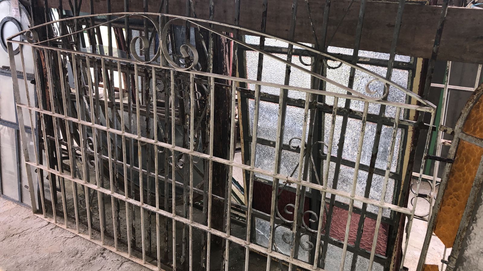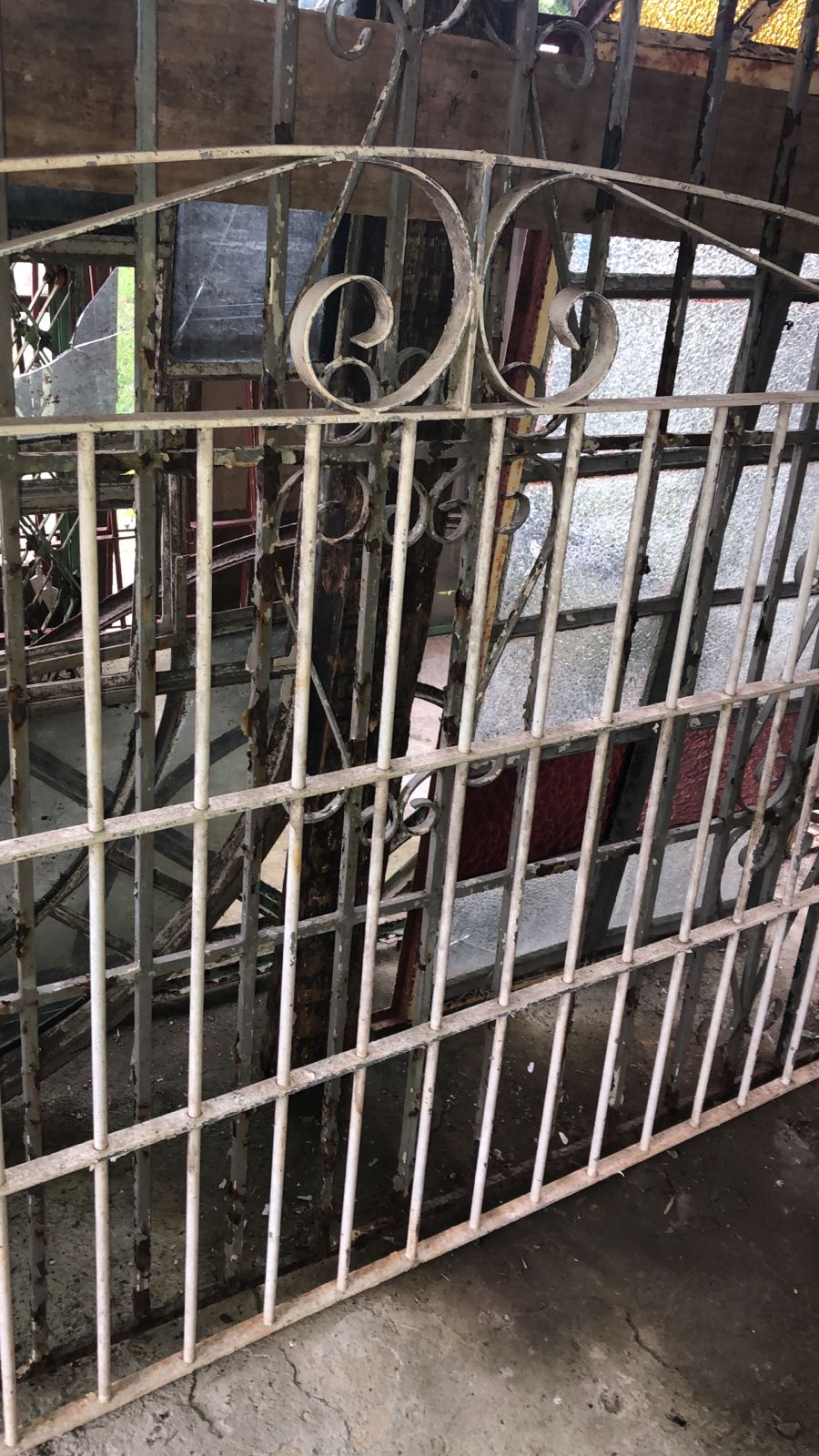 Grade de ferro fundido horizontal de demolição, peça antiga sem acabamento, com topo em semi-arco e detalhes ornamentados.