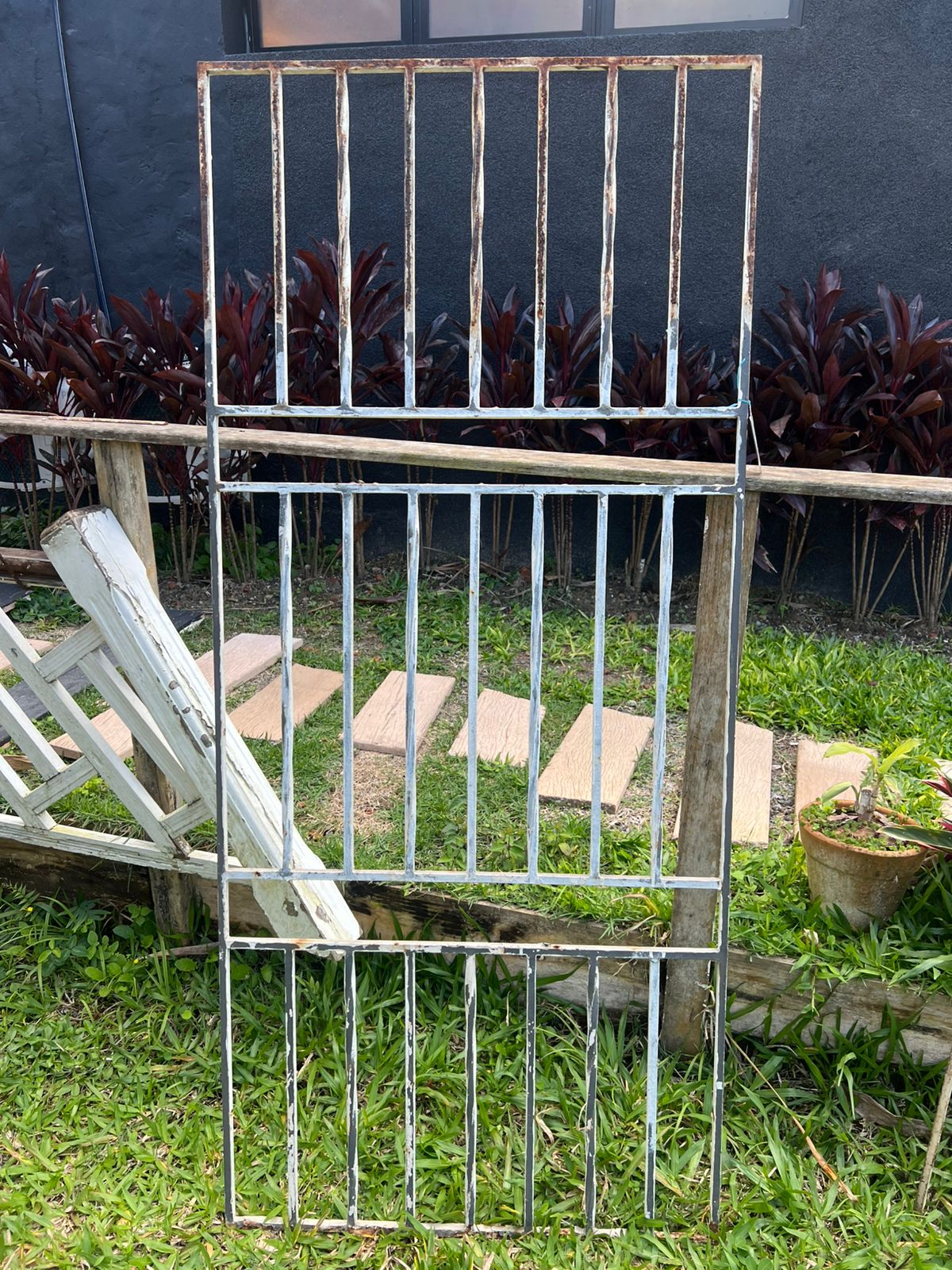 Grade de ferro fundido de demolição, peça sem acabamento, com barras torcidas e vão central. Elemento original ideal para restauração ou aplicação em projetos arquitetônicos e decorativos.