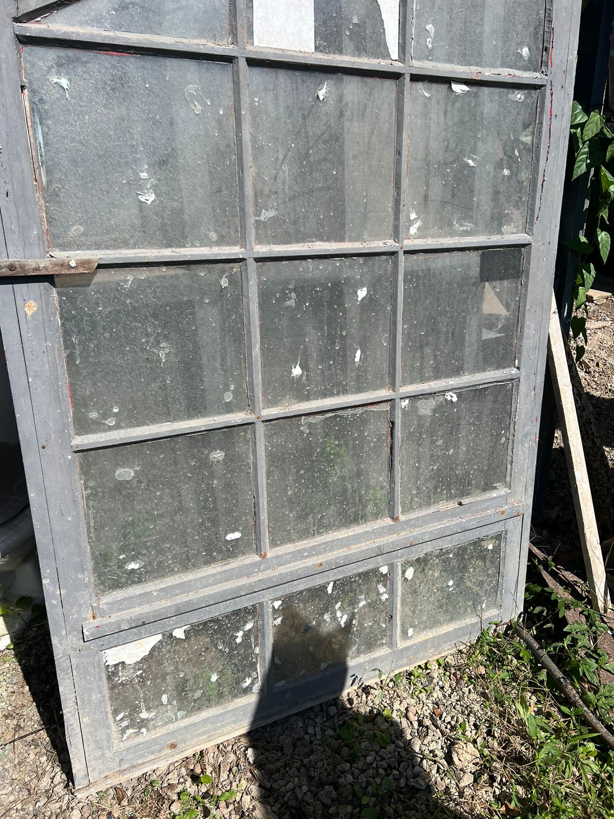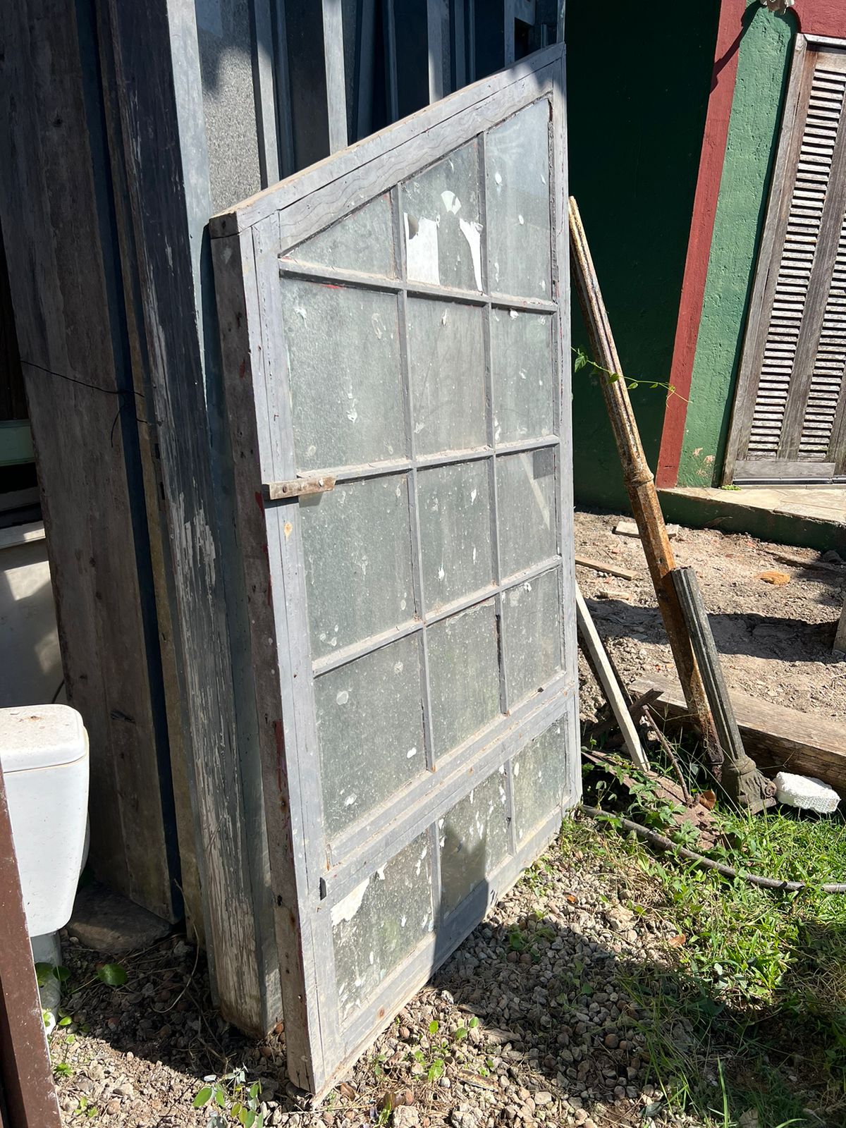 Peça de demolição, feita de madeira nobre, sem acabamento. Parte superior angular, com espaço para vidros.