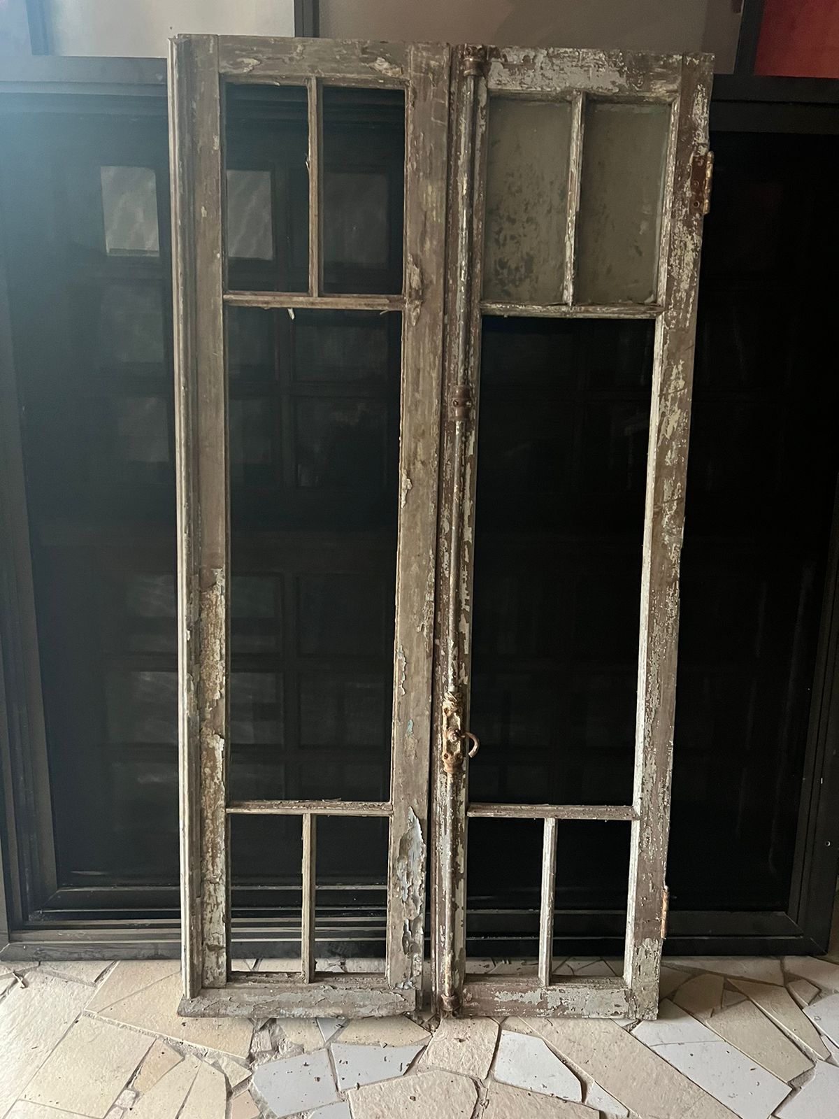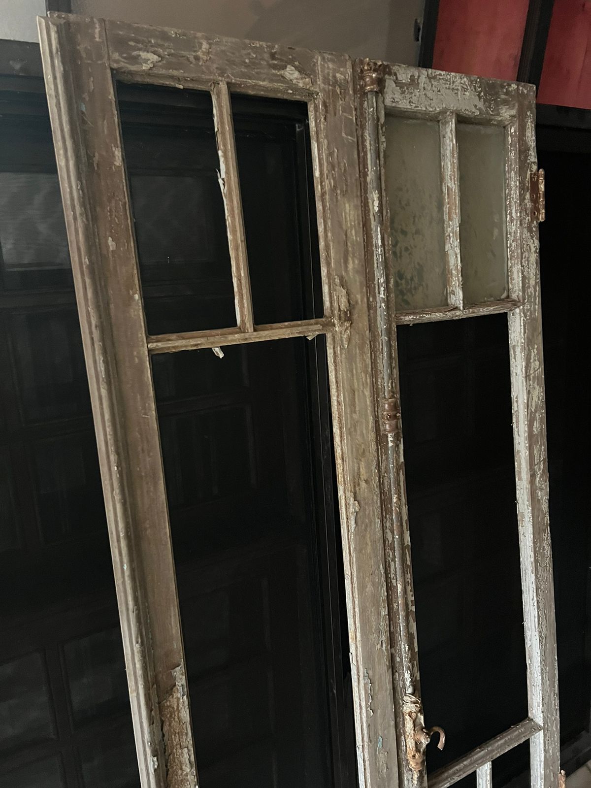Peça de demolição, feita de madeira maciça, sem acabamento. Podendo ser restaurada. Possui divisória para vidros.