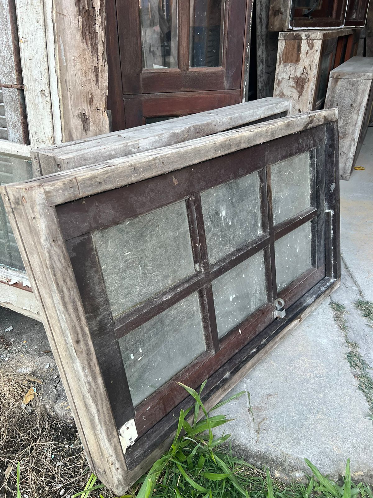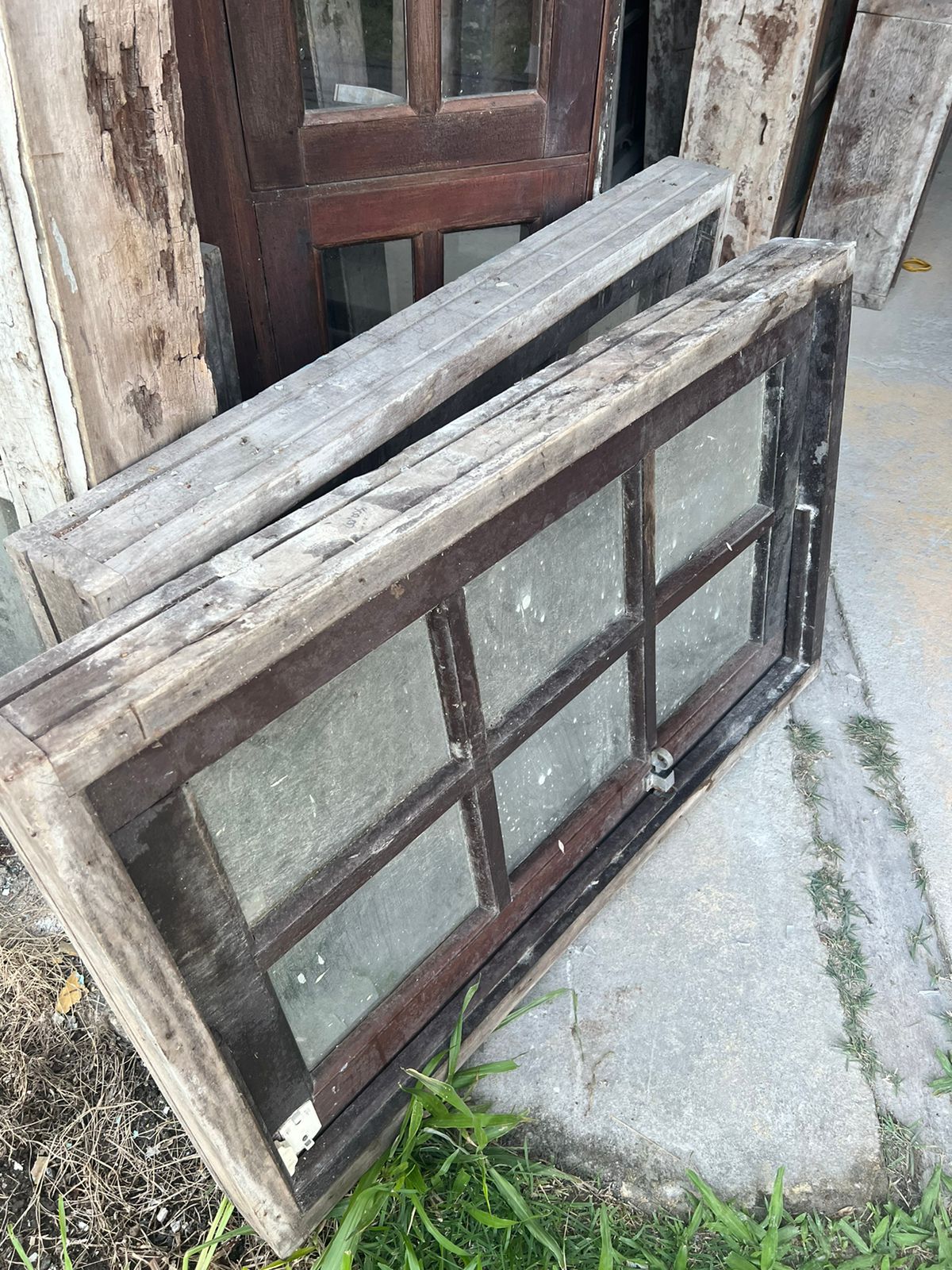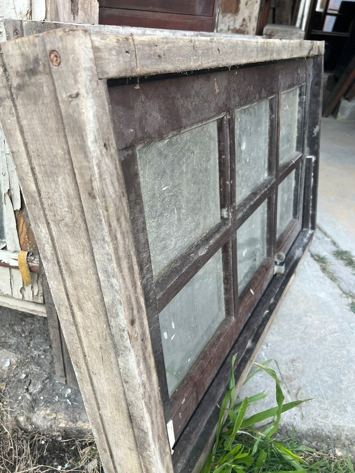 Peça de demolição, sem acabamento. Feita de madeira maciça, com 6 vidros.