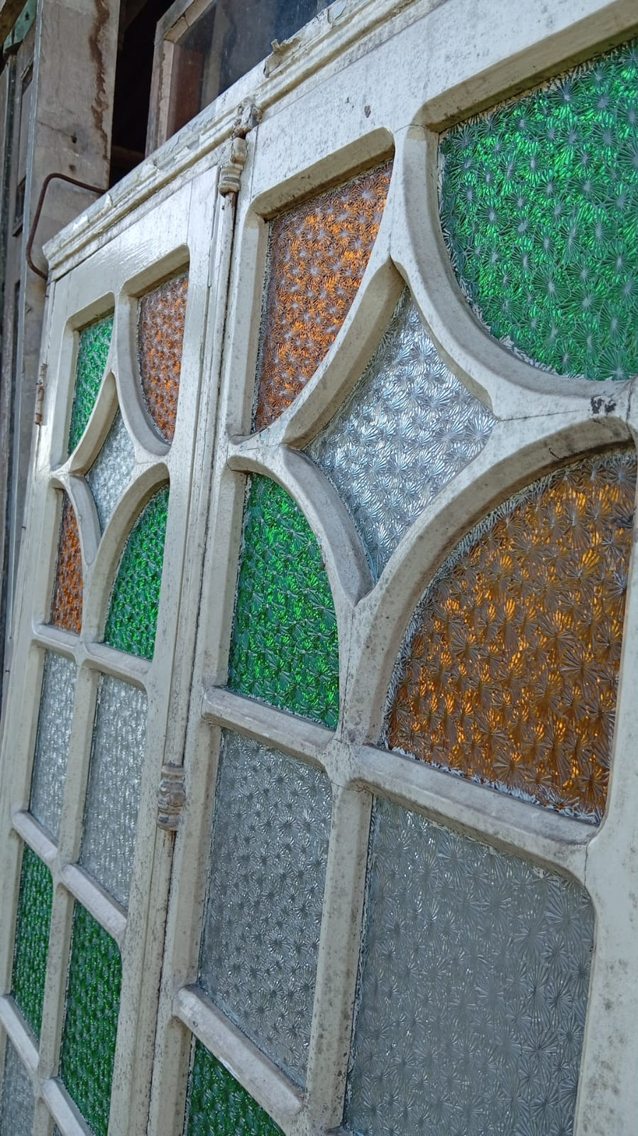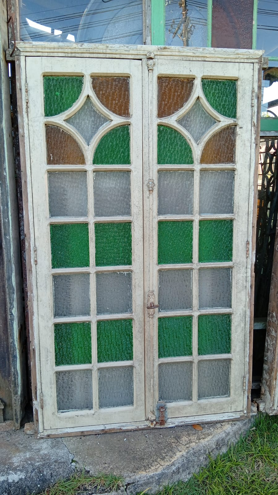 Peça de demolição com vidros coloridos originais e folhas de veneziana. Mantém toda a autenticidade do tempo e acompanha batentes.
