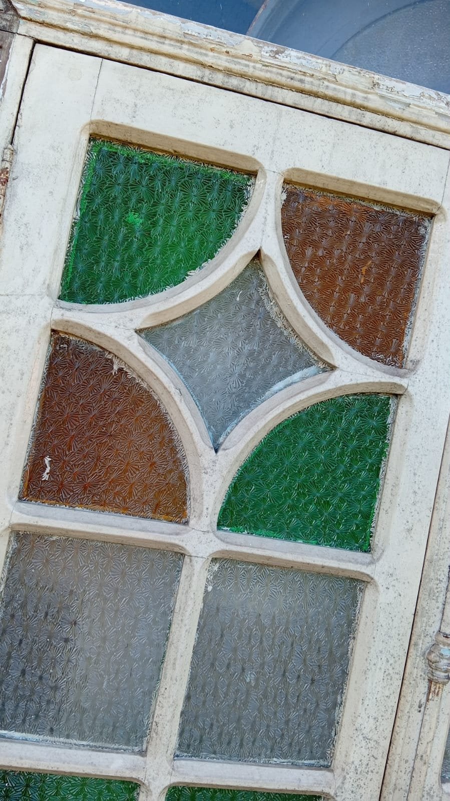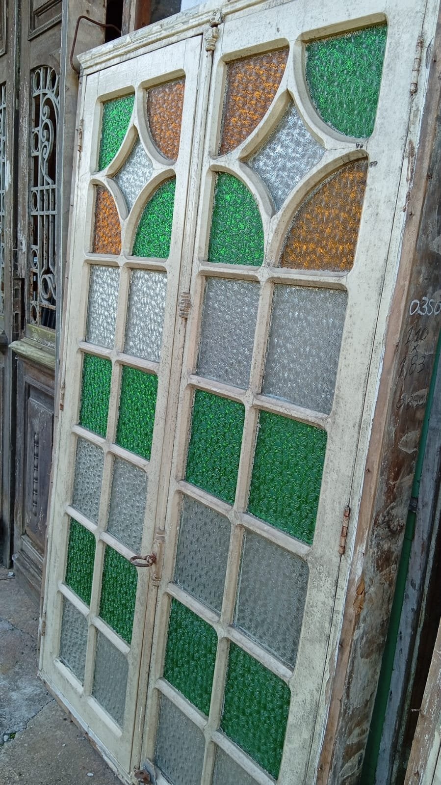 Peça de demolição com vidros coloridos originais e folhas de veneziana. Mantém toda a autenticidade do tempo e acompanha batentes.