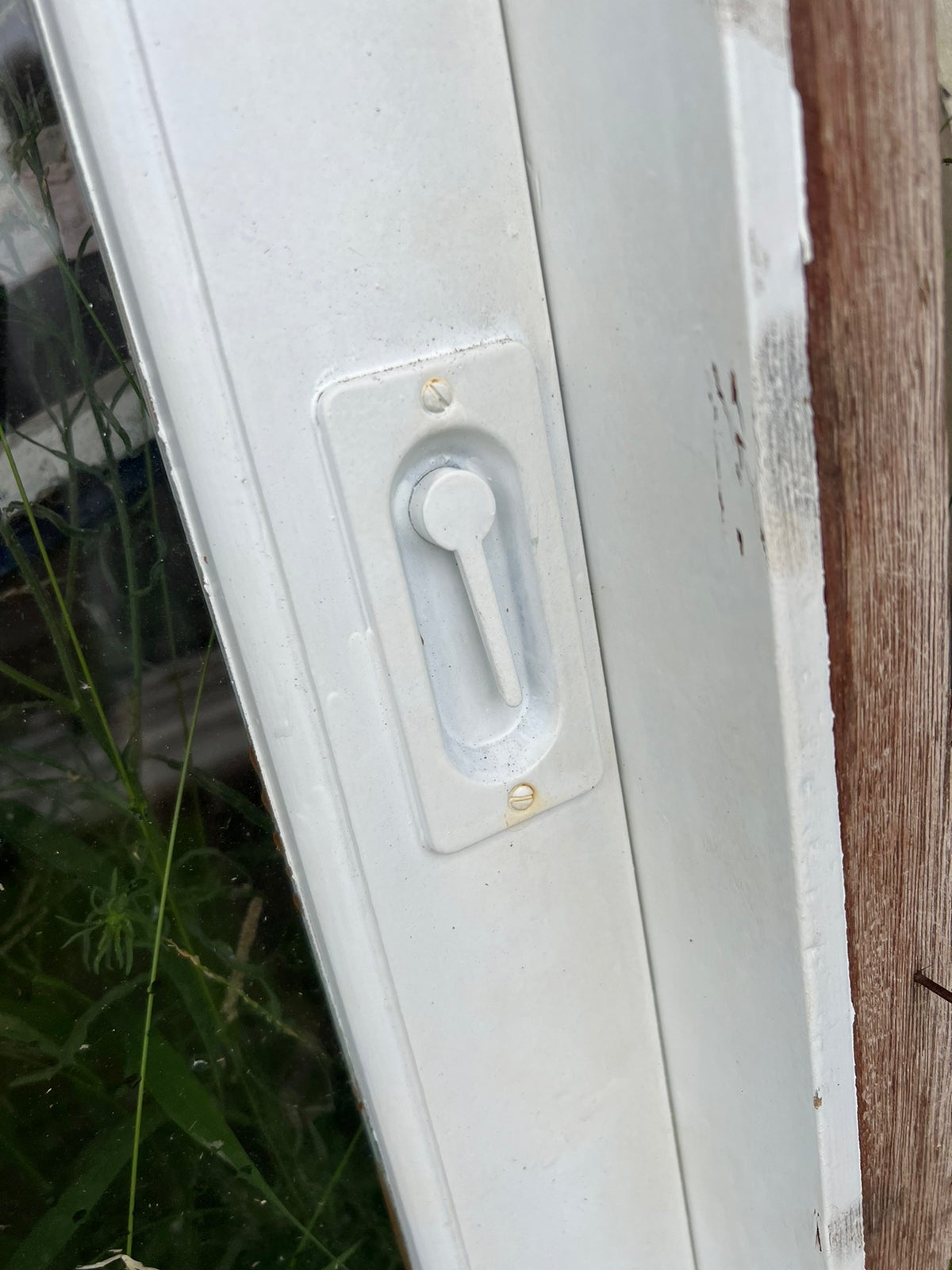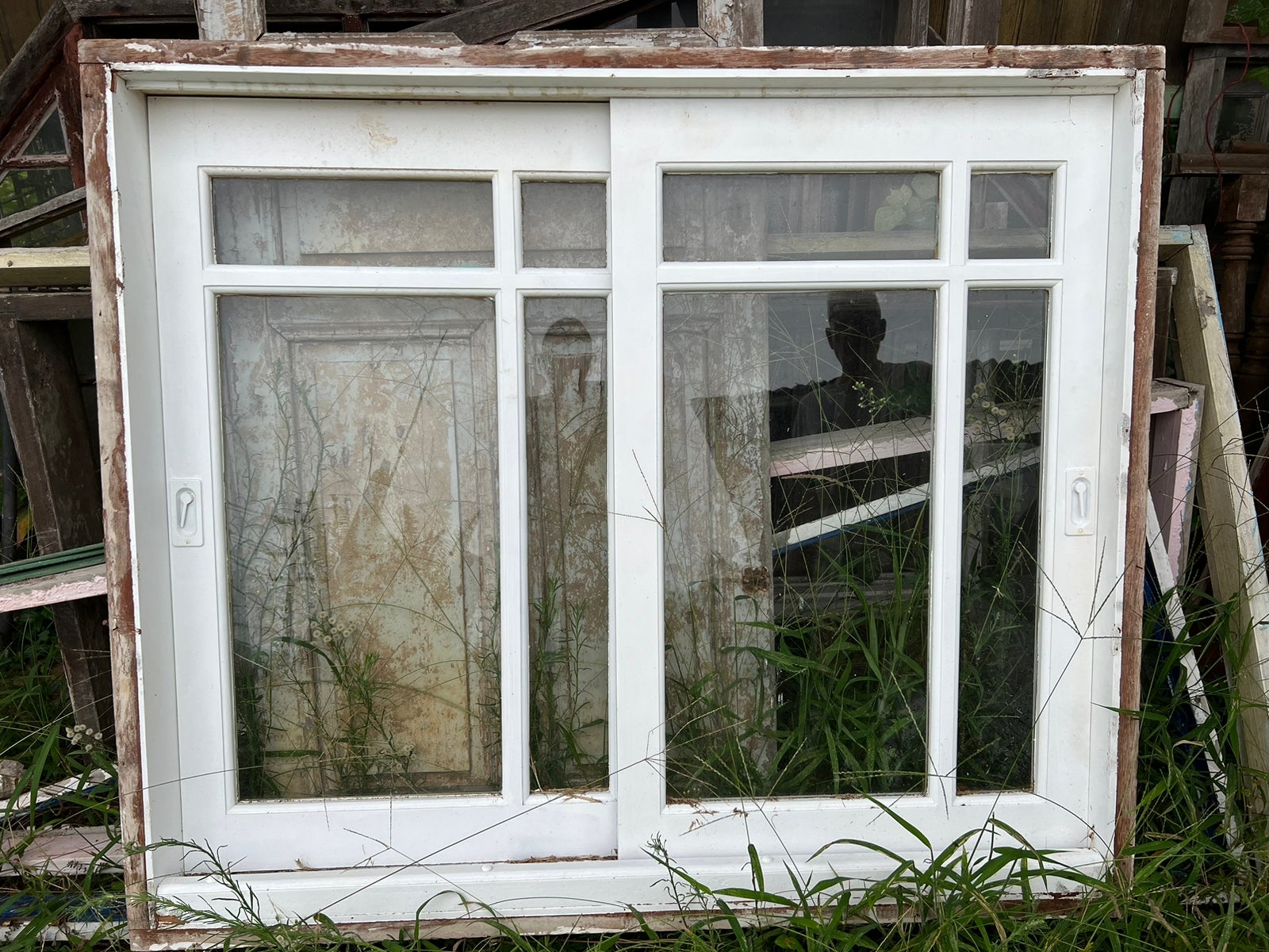Feita de madeira maciça, pinta de branco, sem acabamento. Possui folhas de correr, com vidros incolor.