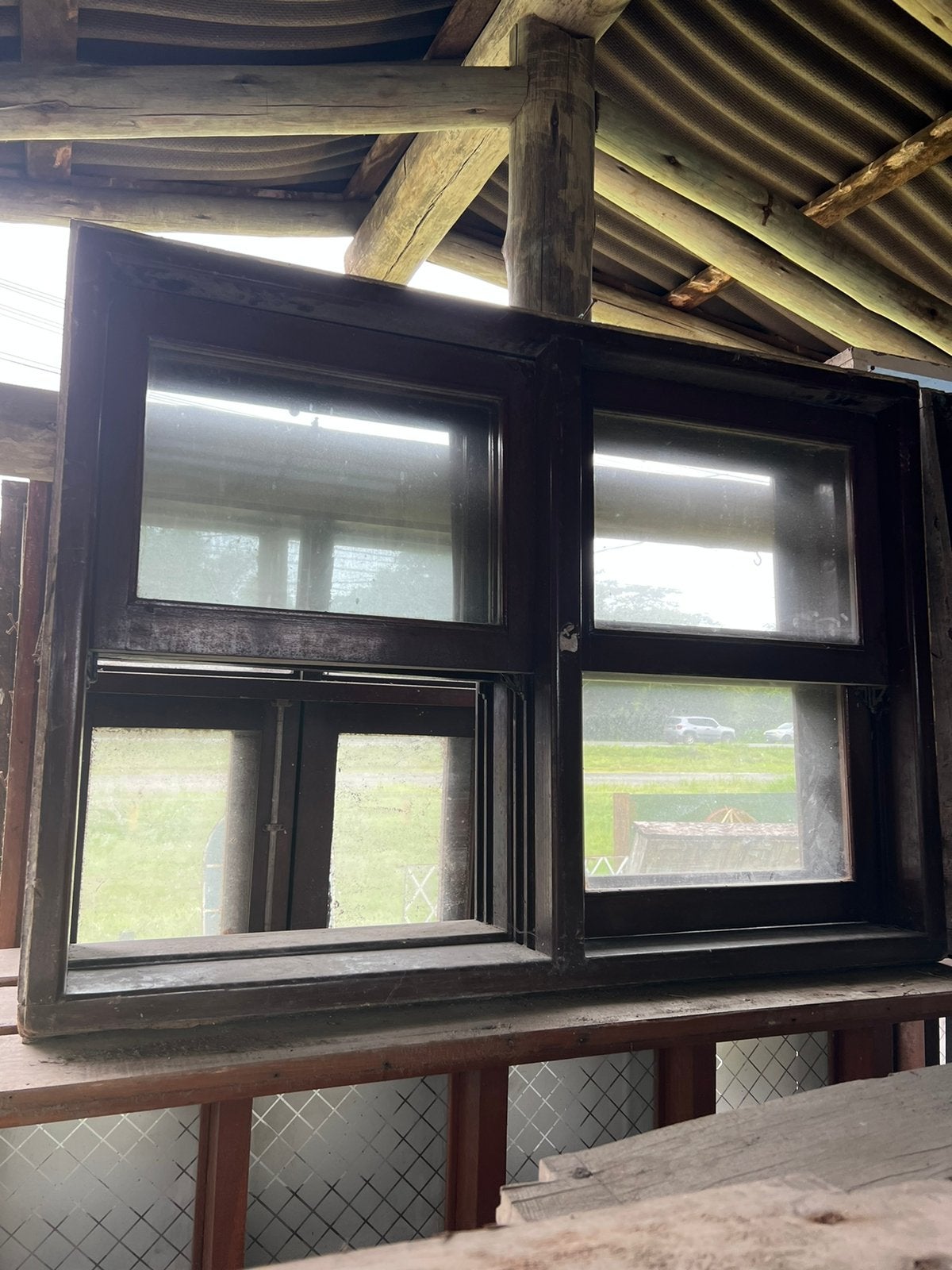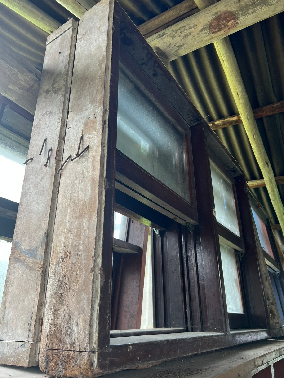 Feita de madeira maciça, sem acabamento. Possui vidros incolor.
