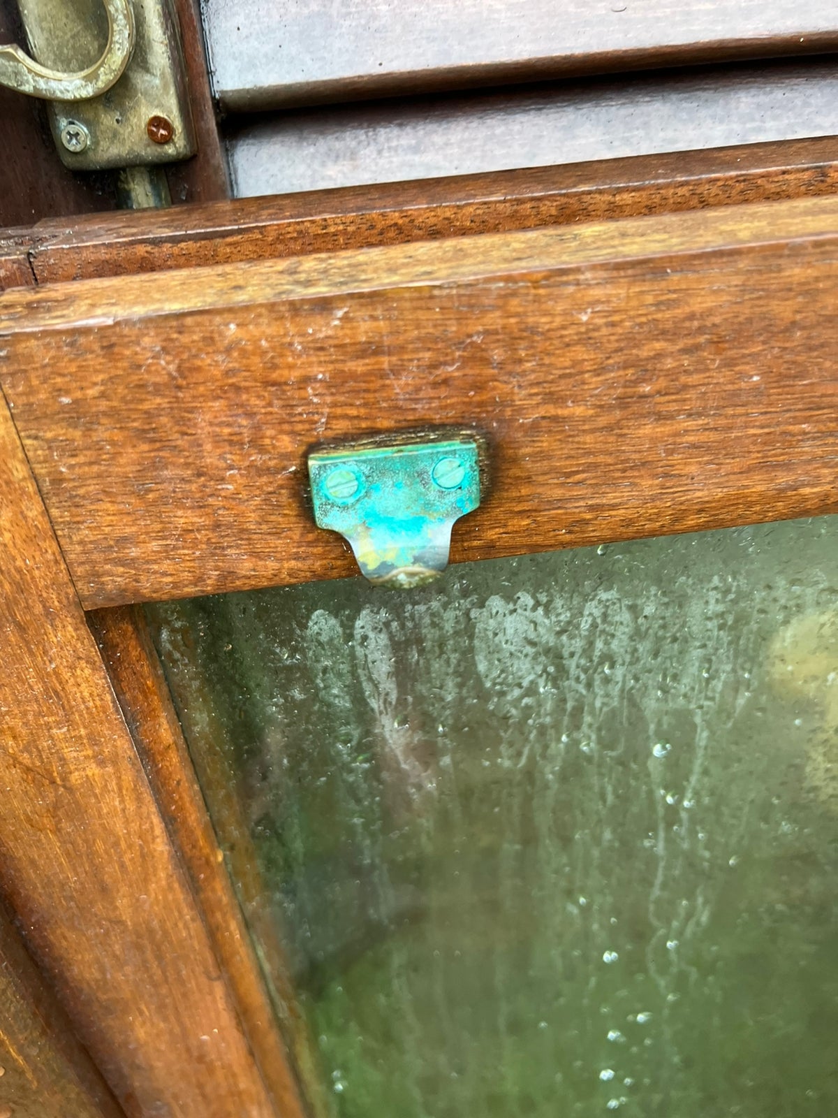 Feita de madeira maciça, sem acabamento. Possui veneziana e folha guilhotina com vidros incolor. Possui ferragens e fechadura.