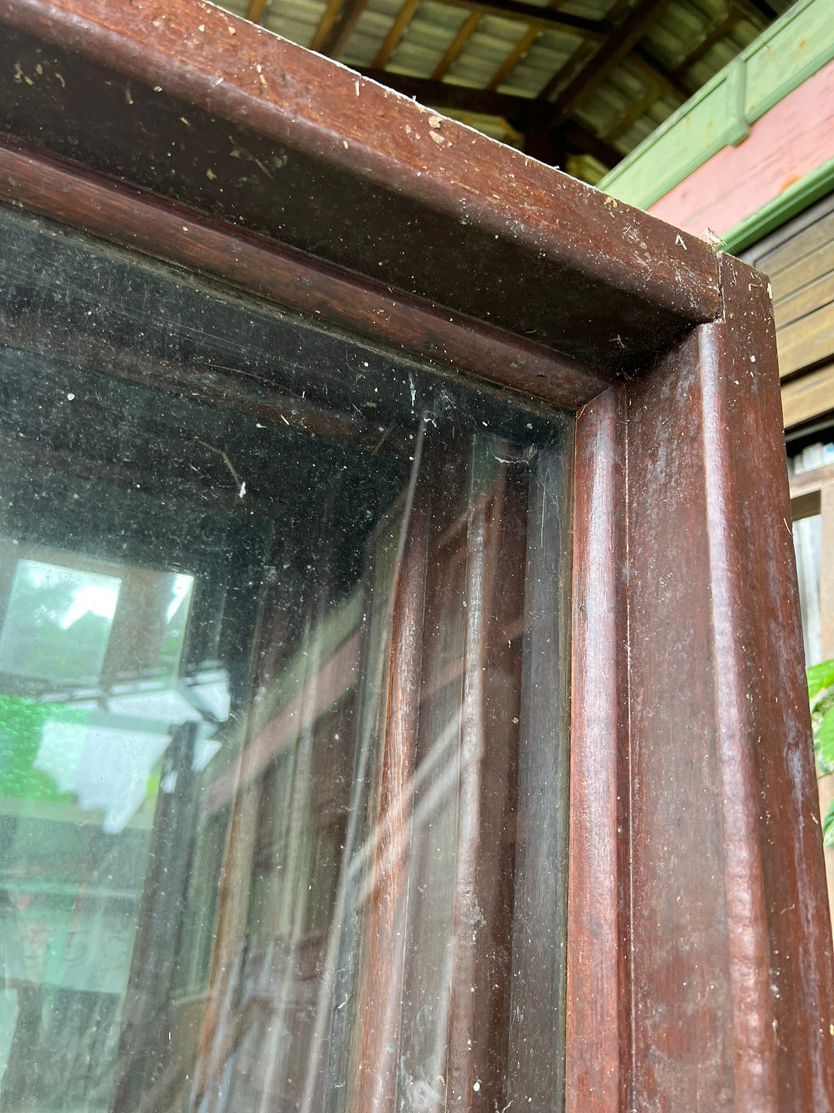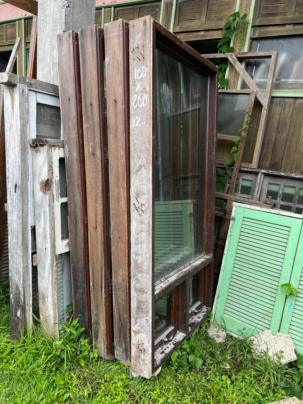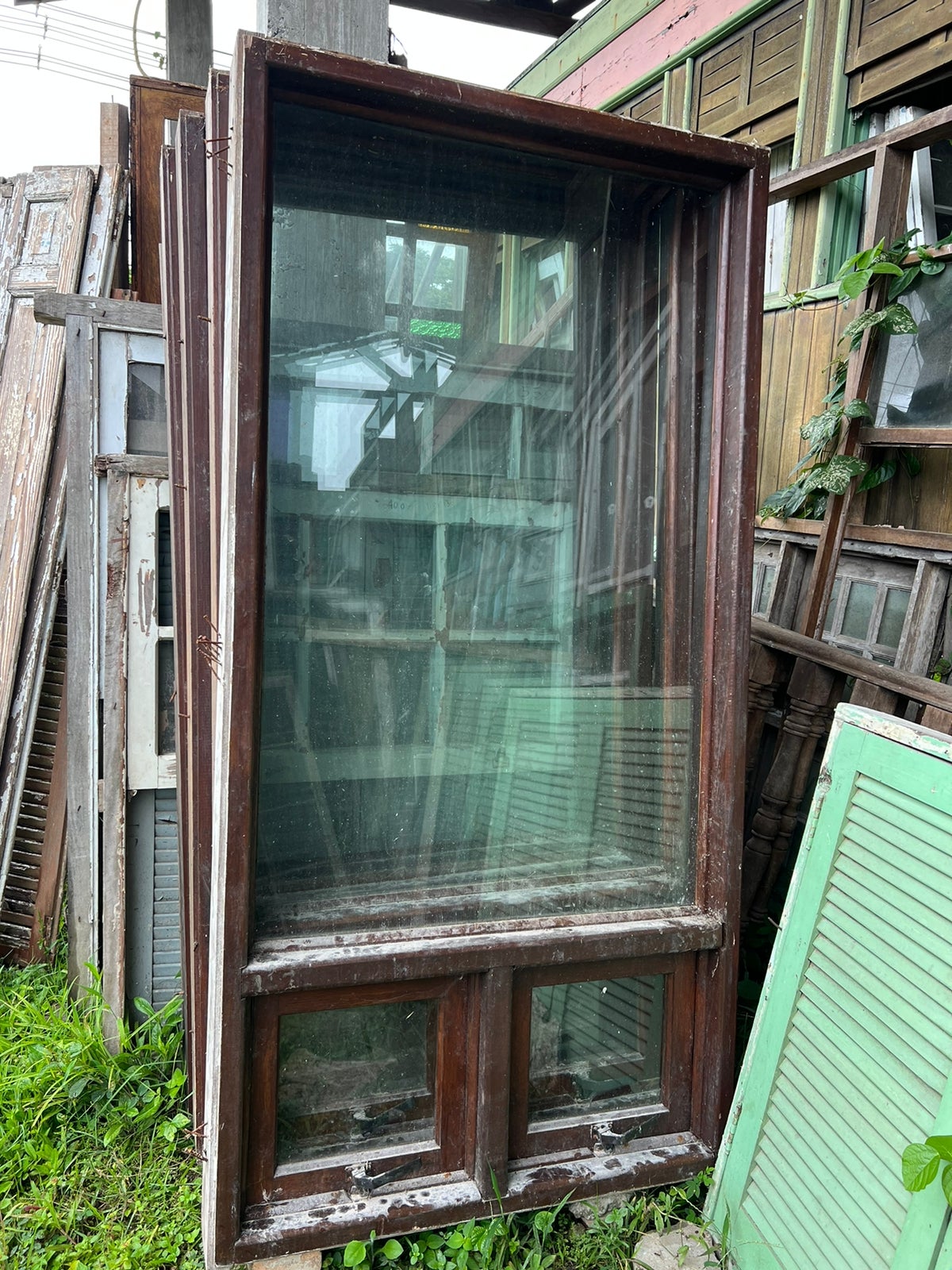 Feito de madeira maciça, sem acabamento. Possui 2 basculante pequeno com vidro na parte inferior e um vidro fixo na parte superior.