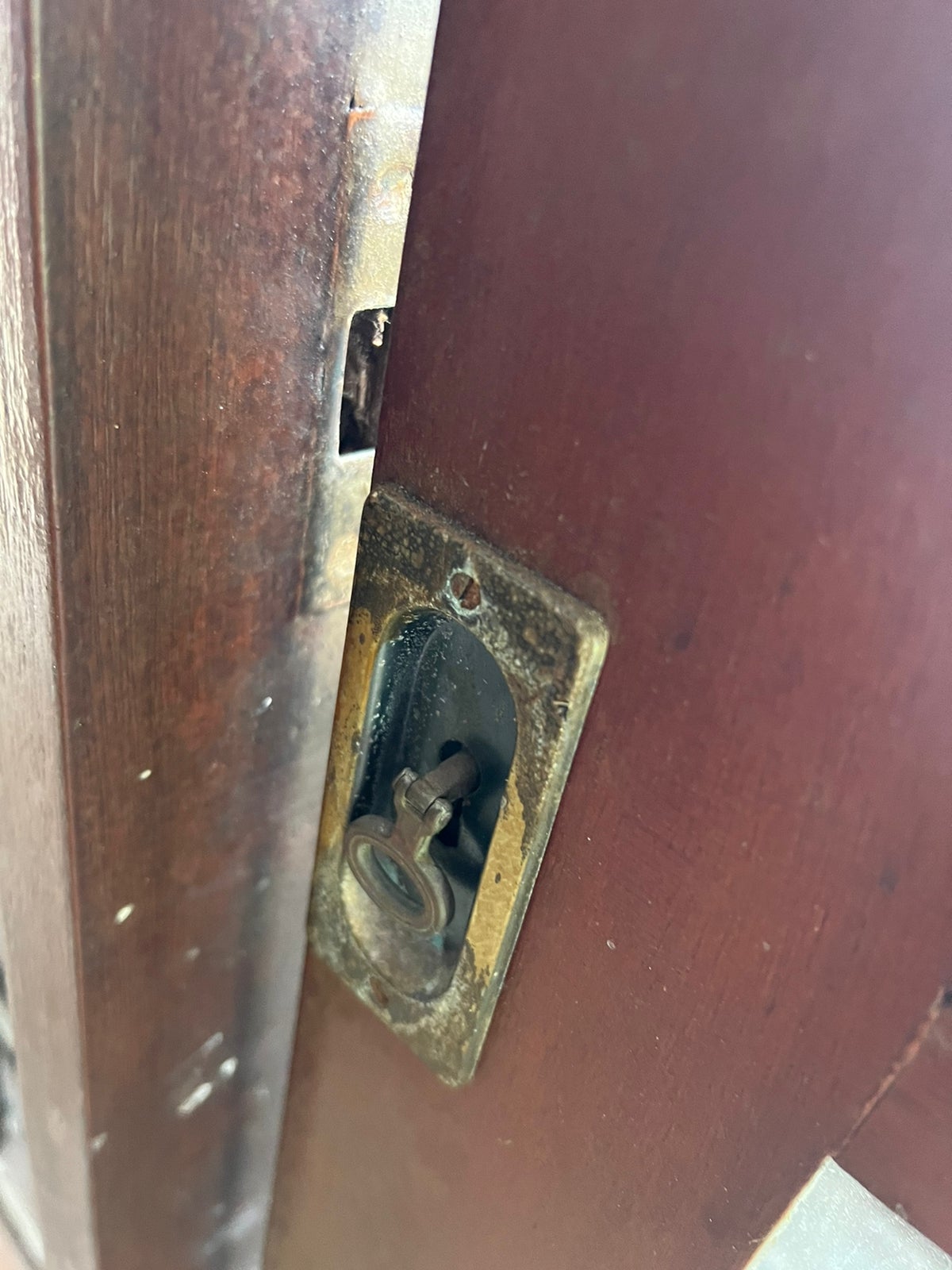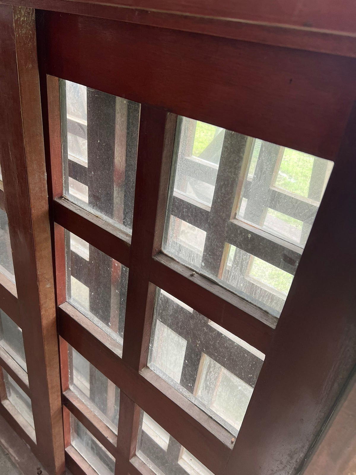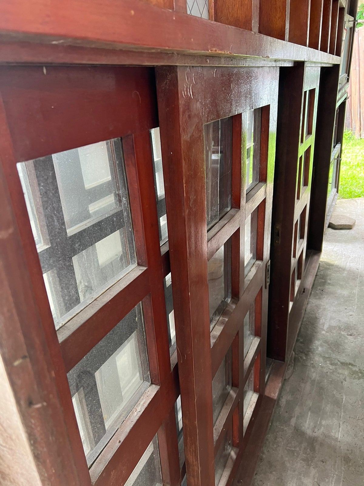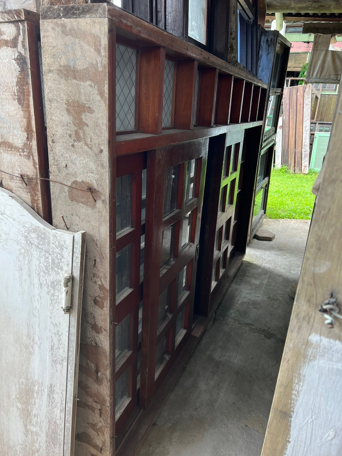 Feito de madeira maciça, possui folhas de correr, com vidros jateados e incolor. Possui puxadores.