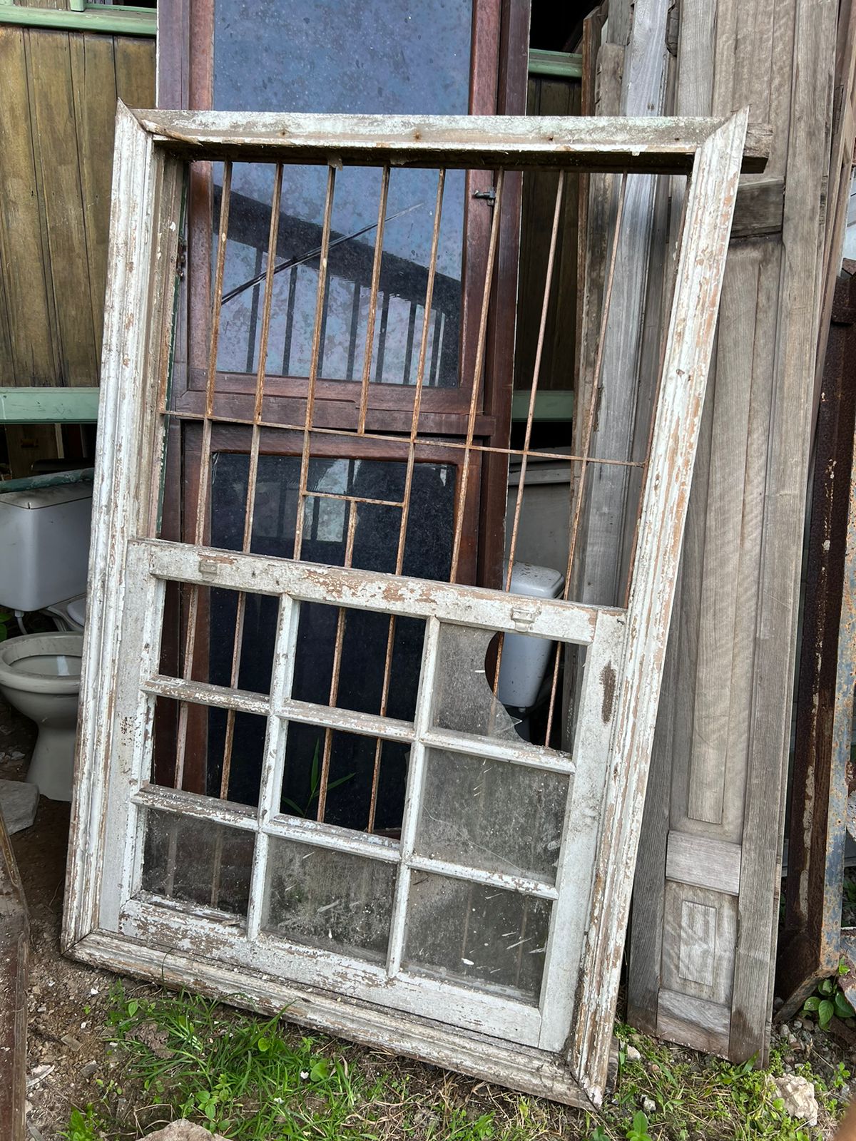 Feito de madeira de pinho de riga, sem acabamento. Abertura em guilhotina. Possui grade de ferro.
