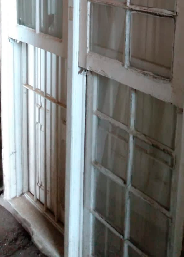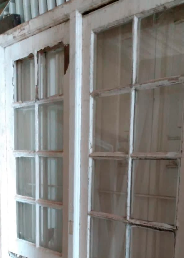 Peça antiga, sem acabamento, com pintura branca. Possui folha com vidros que fecham em guilhotina e folhas de veneziana. Com grade de ferro.