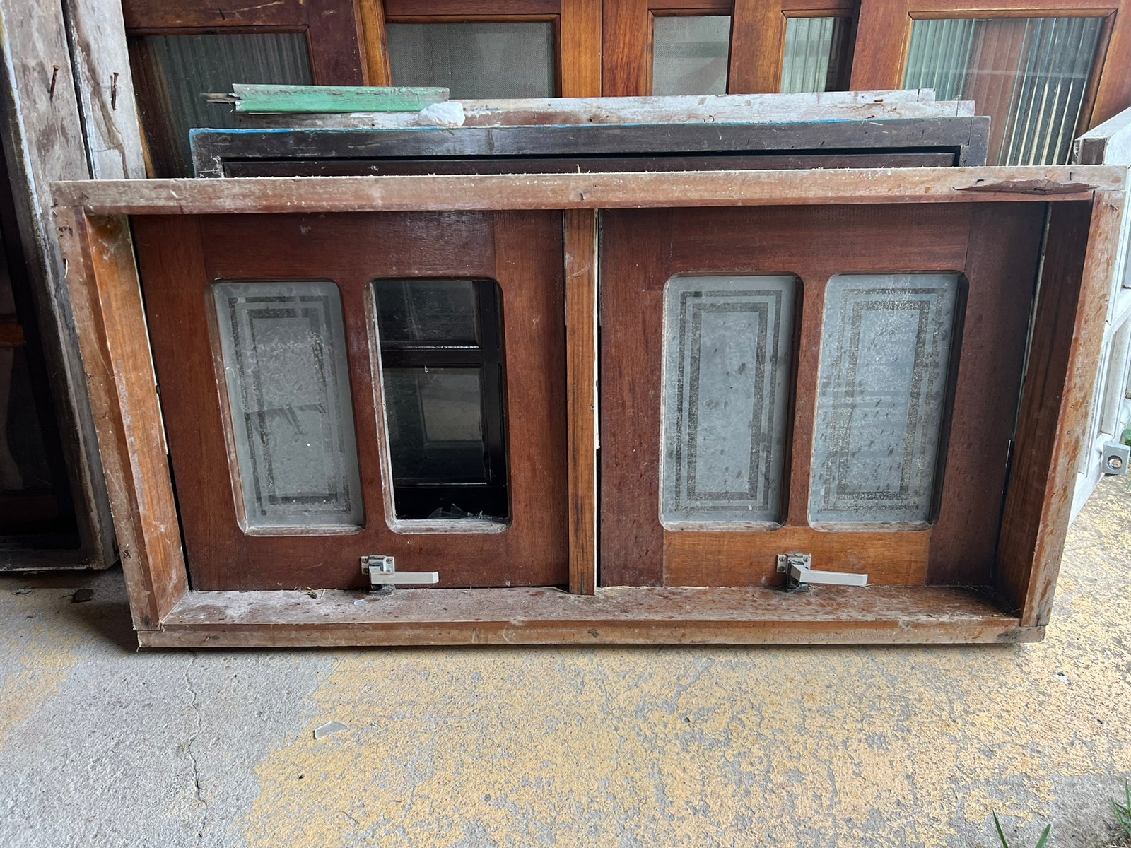 Feito de madeira maciça, sem acabamento. Com 2 folhas com vidros incolor e puxadores, que abrem individual.
