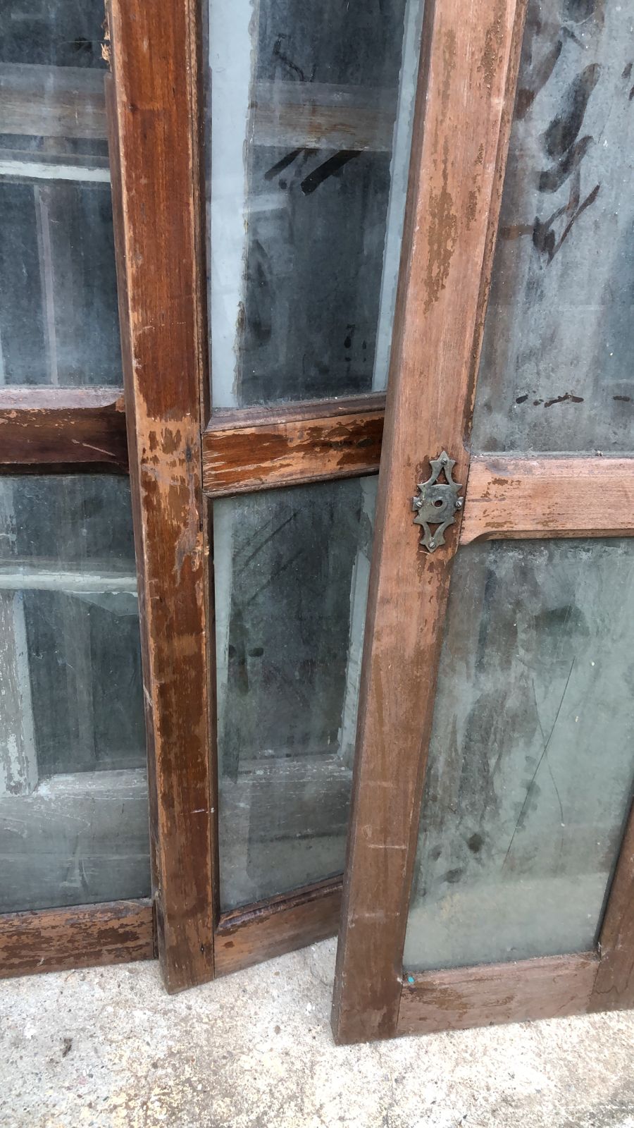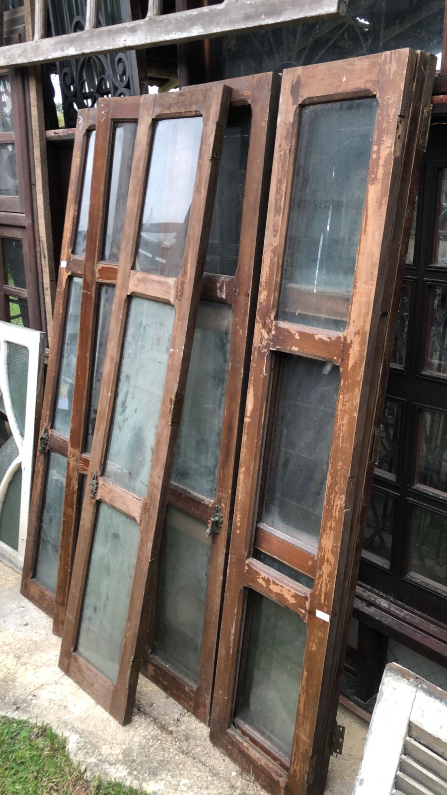 Folhas de janela antigas de madeira maciça de demolição, sem acabamento. Conjunto com 8 folhas compridas, modelo simples, cada uma com espaço para 3 vidros. Estruturas versáteis que podem ser restauradas ou reaproveitadas em composições decorativas, painéis ou divisórias.