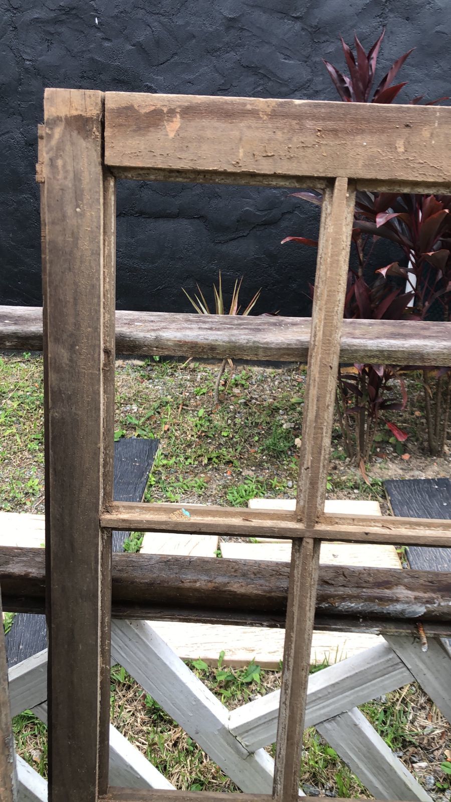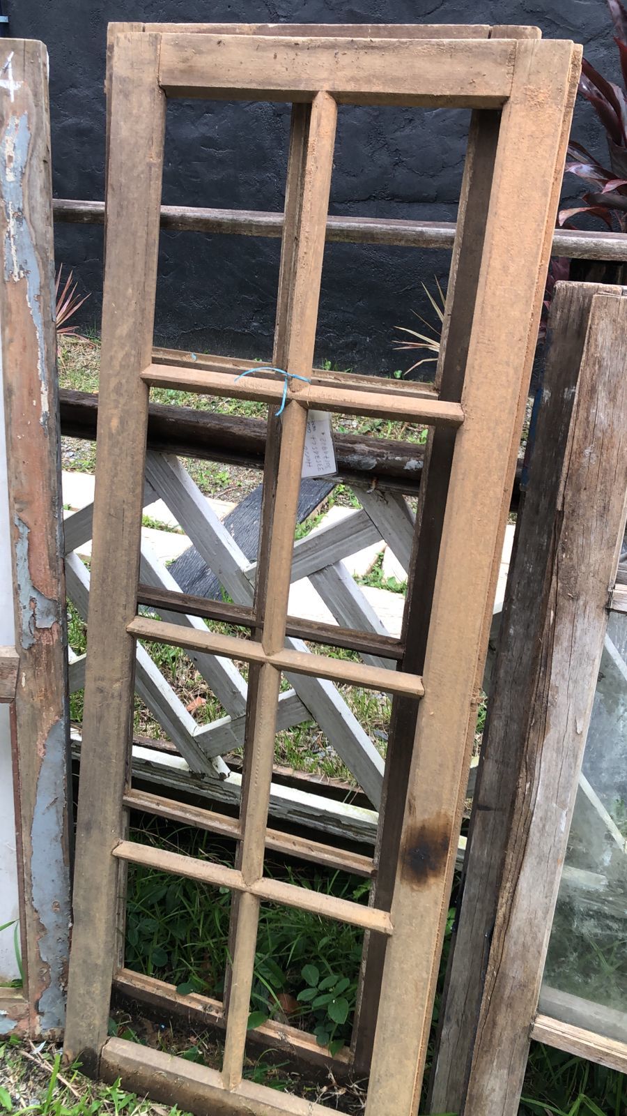 Janela antiga de madeira maciça de demolição, peça sem acabamento, com espaço para vidros para vidros menores.