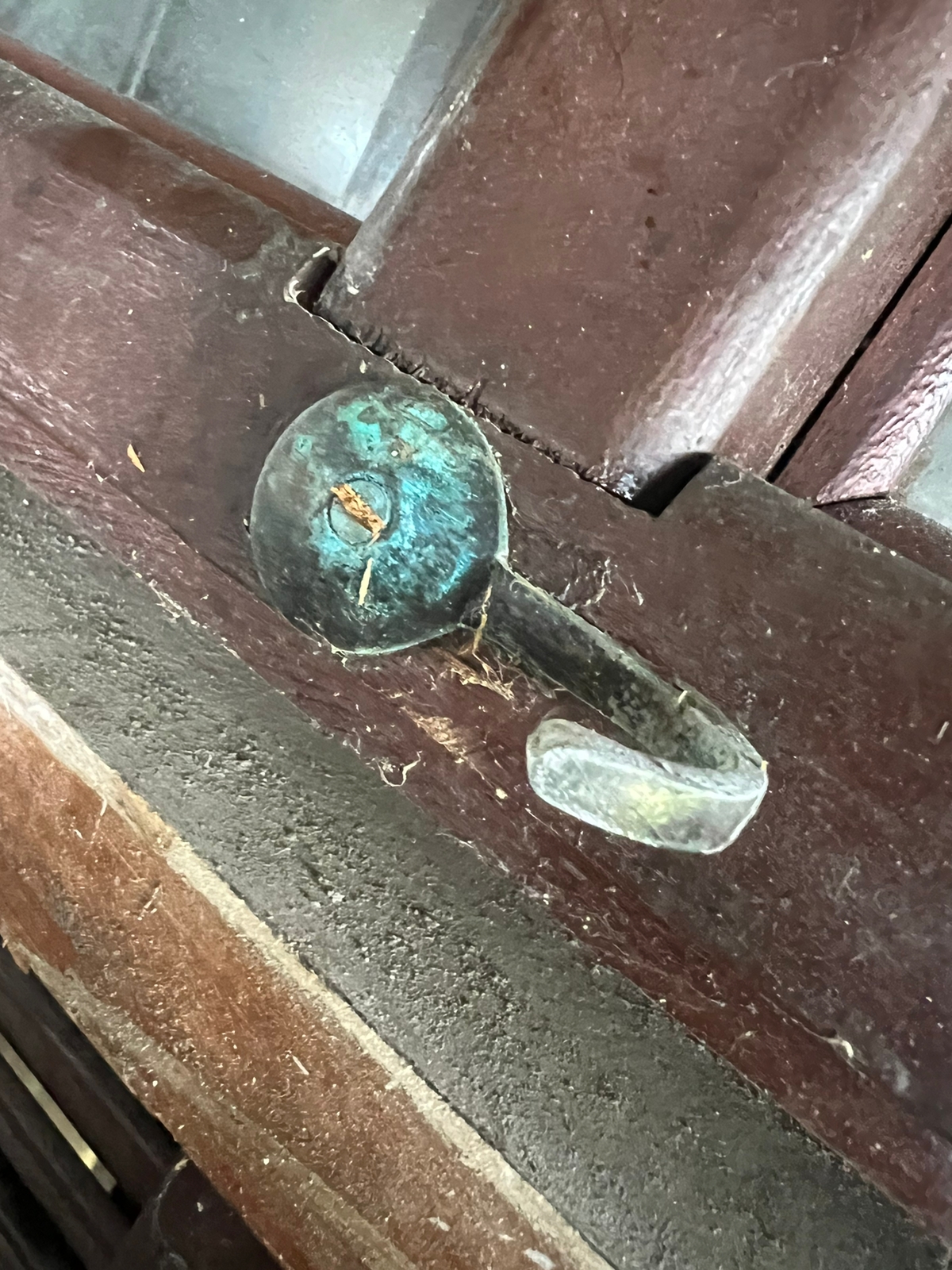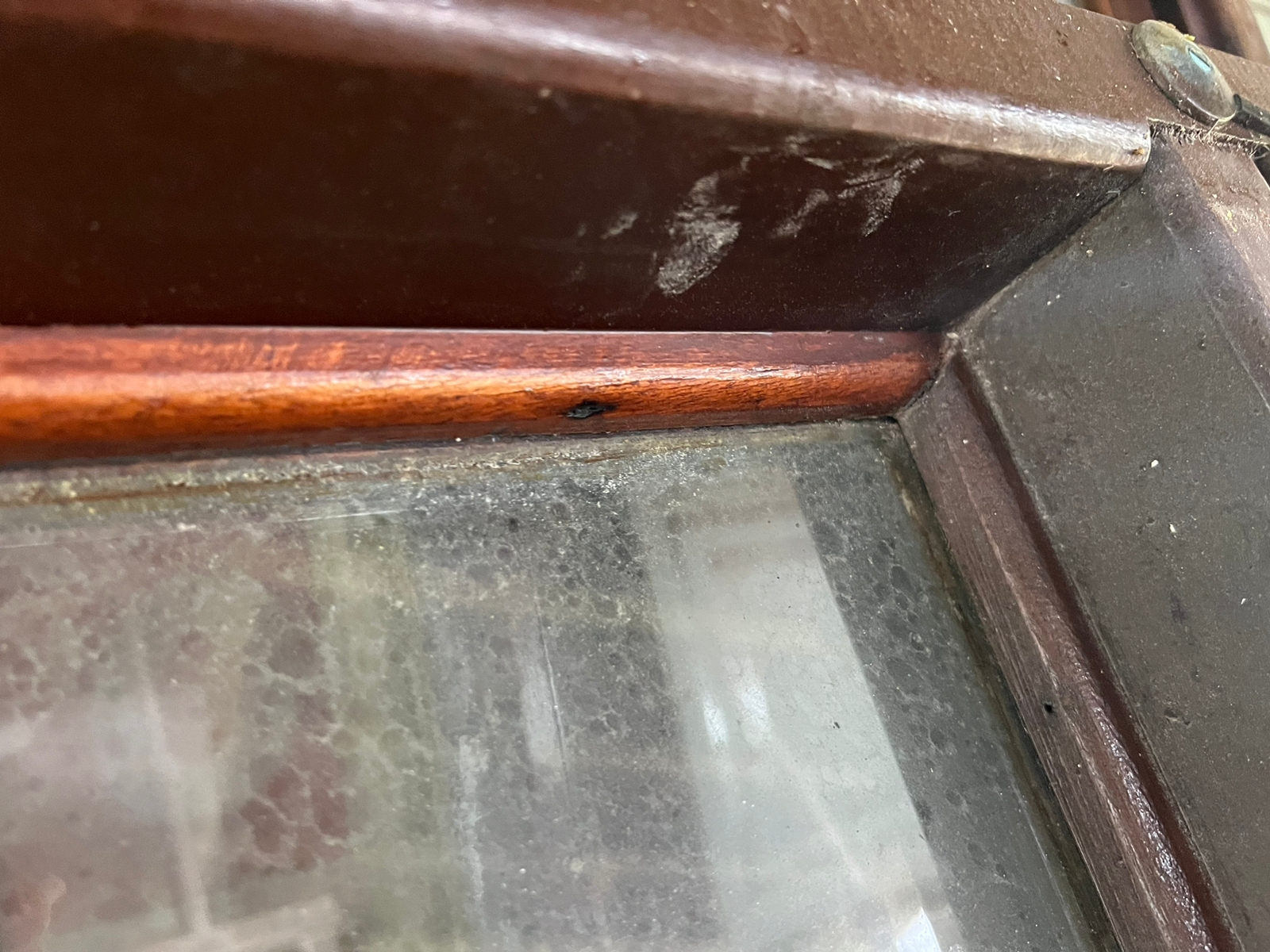 Feito de madeira maciça, sem acabamento. Possui 2 vidros incolor.