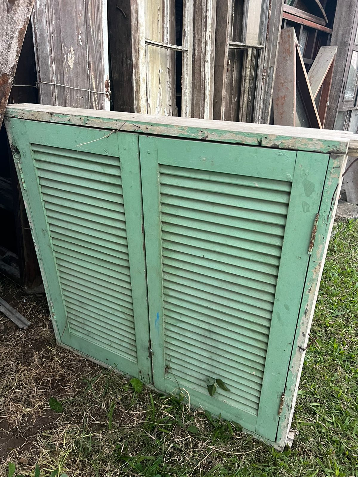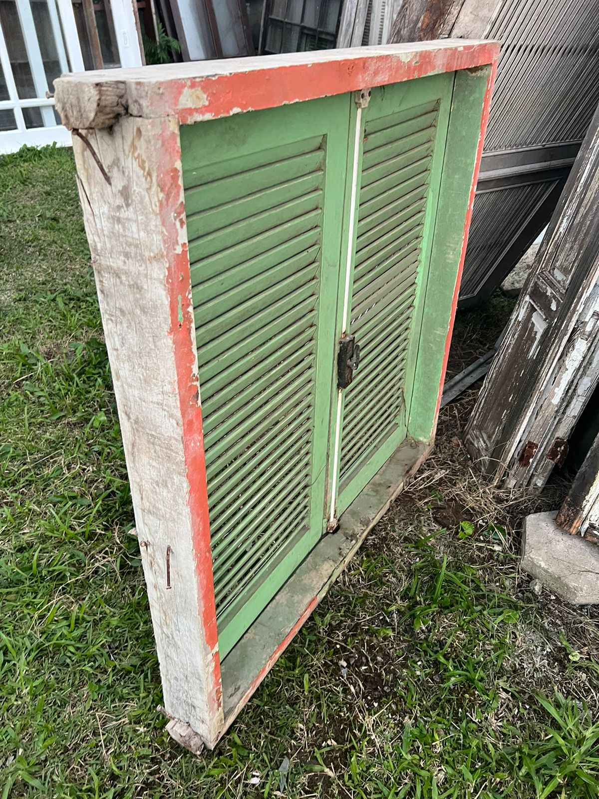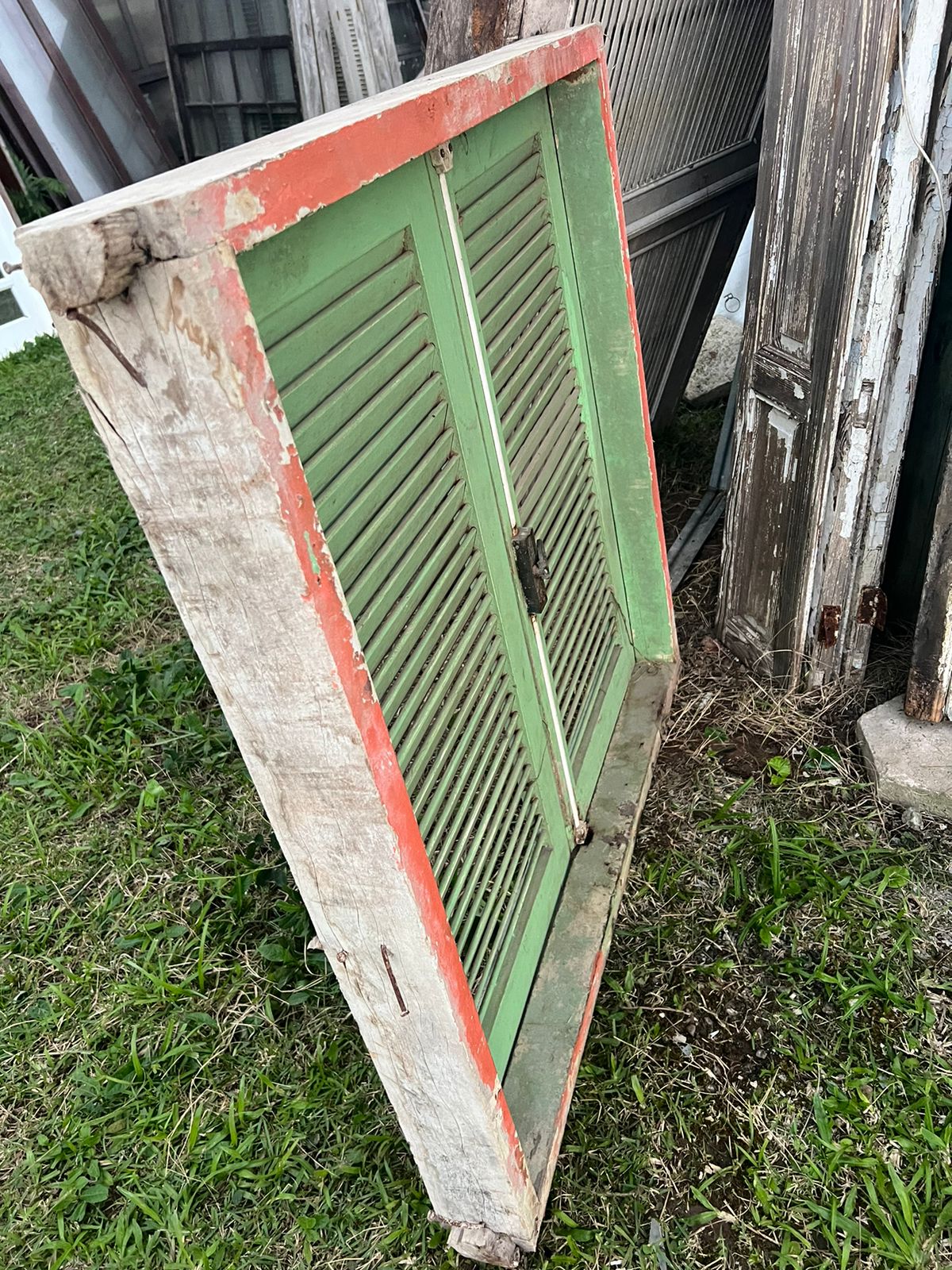 Peça de demolição, sem acabamento, na cor verde. Possui cremona e batentes.