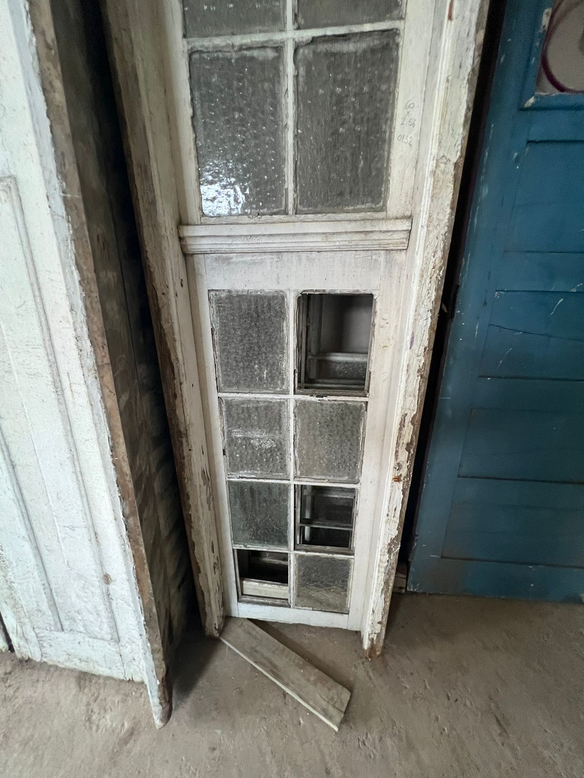 Peça de demolição fabricada em madeira maciça, sem acabamento e na cor branca. O design funcional combina uma parte superior fixa com uma parte inferior de abrir, oferecendo versatilidade para diversos projetos de decoração e arquitetura.