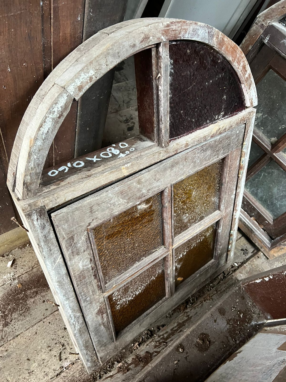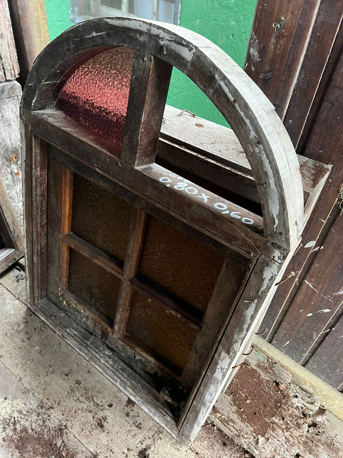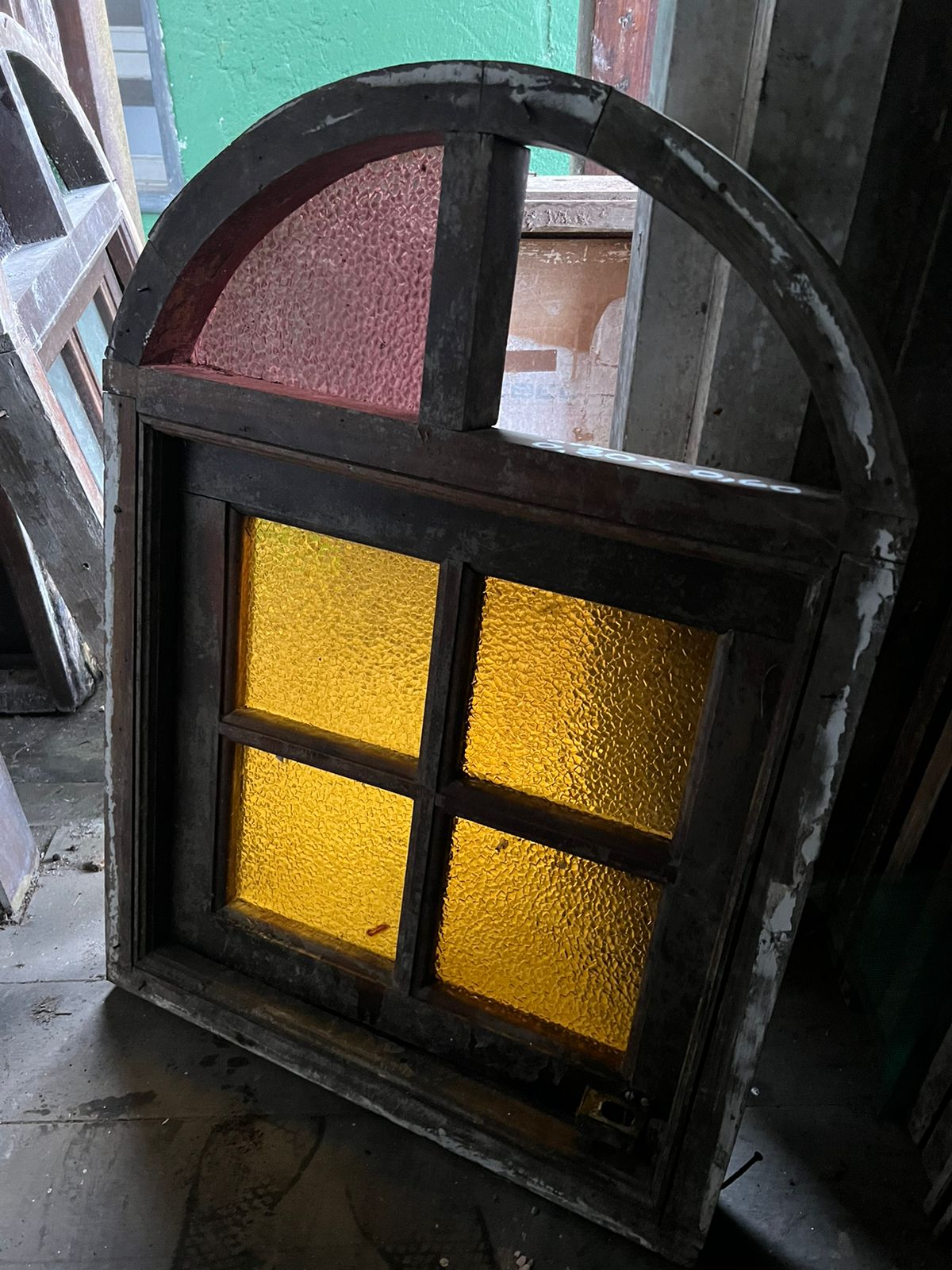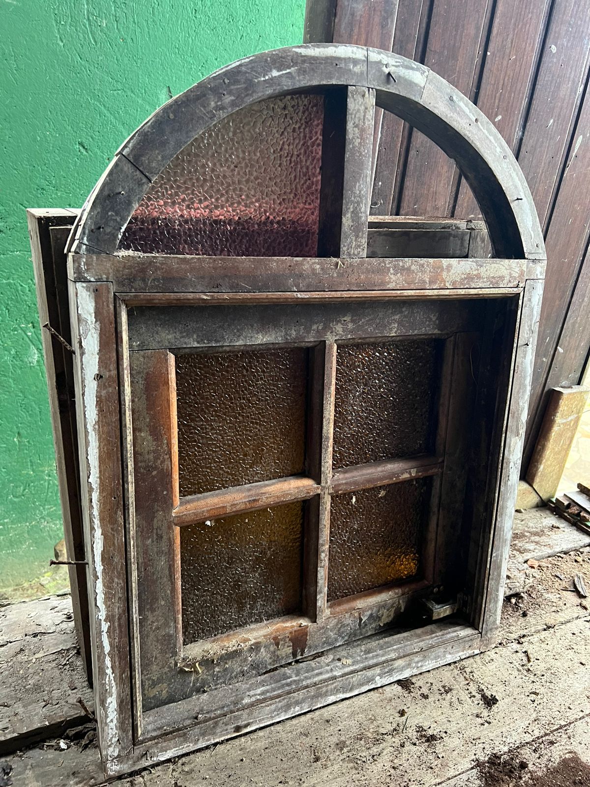Peça antiga, sem acabamento. Possui vidros árticos coloridos.