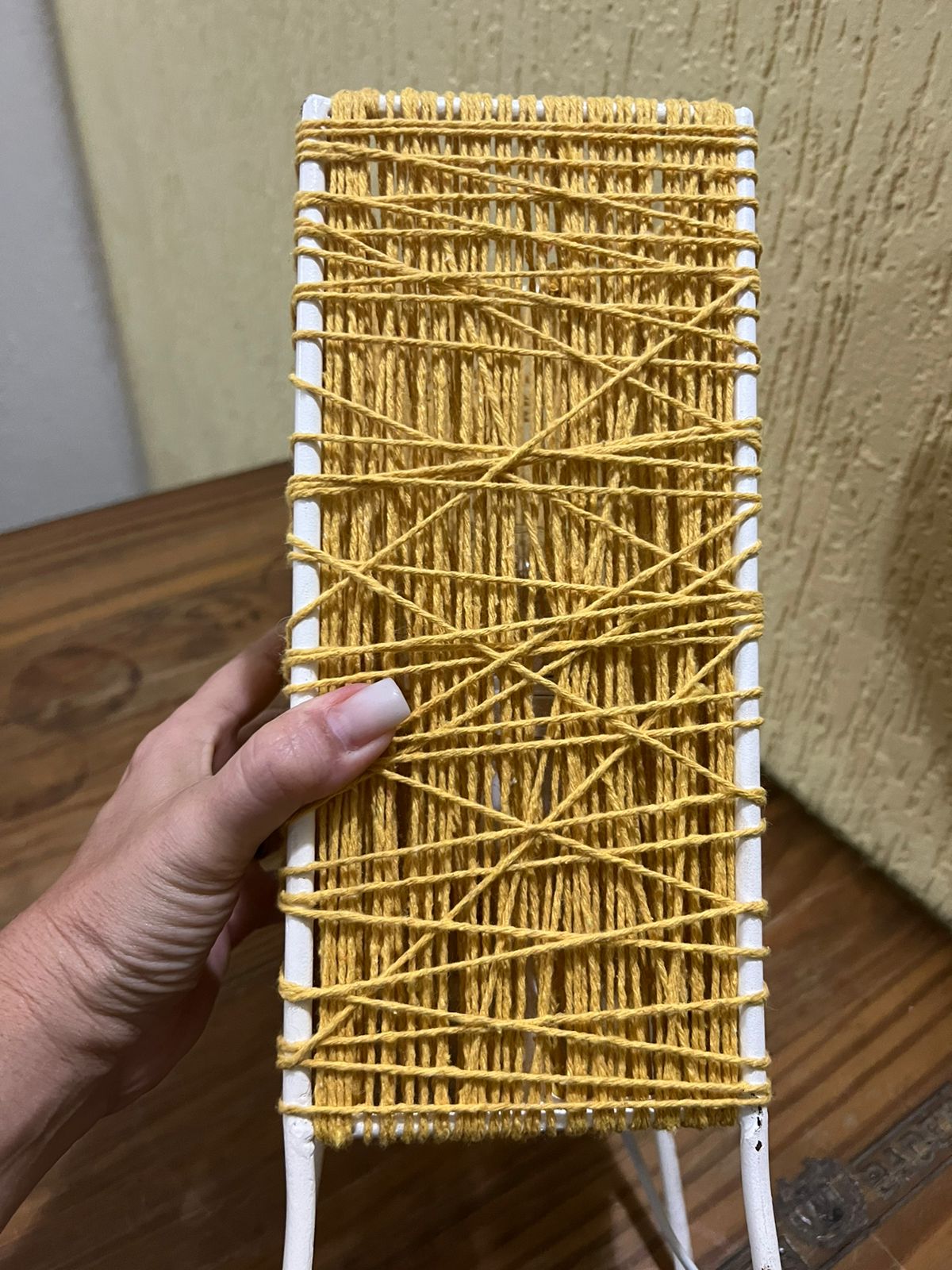 Com armação em ferro e com linhas coloridas reutilizadas na cor amarela.