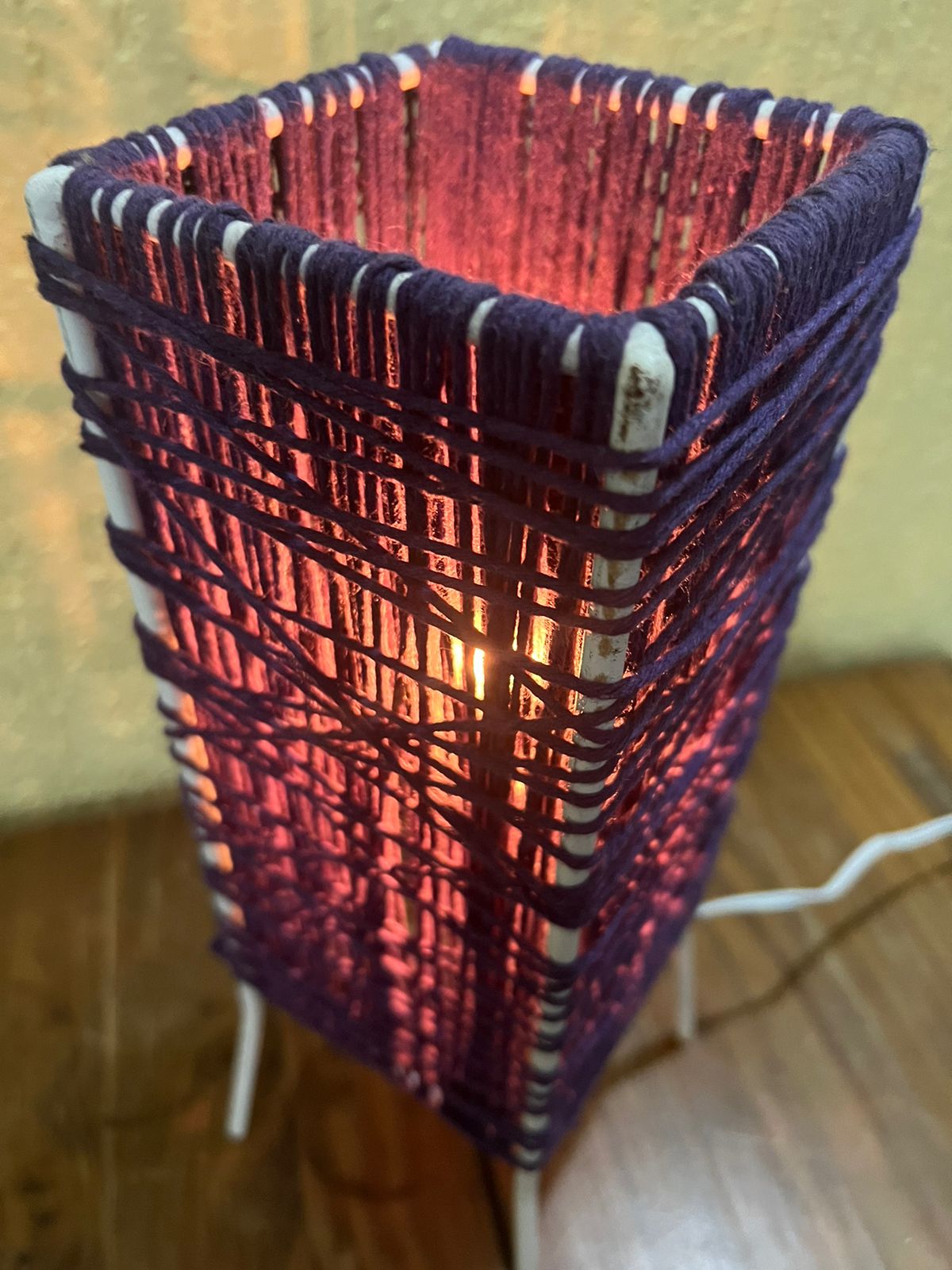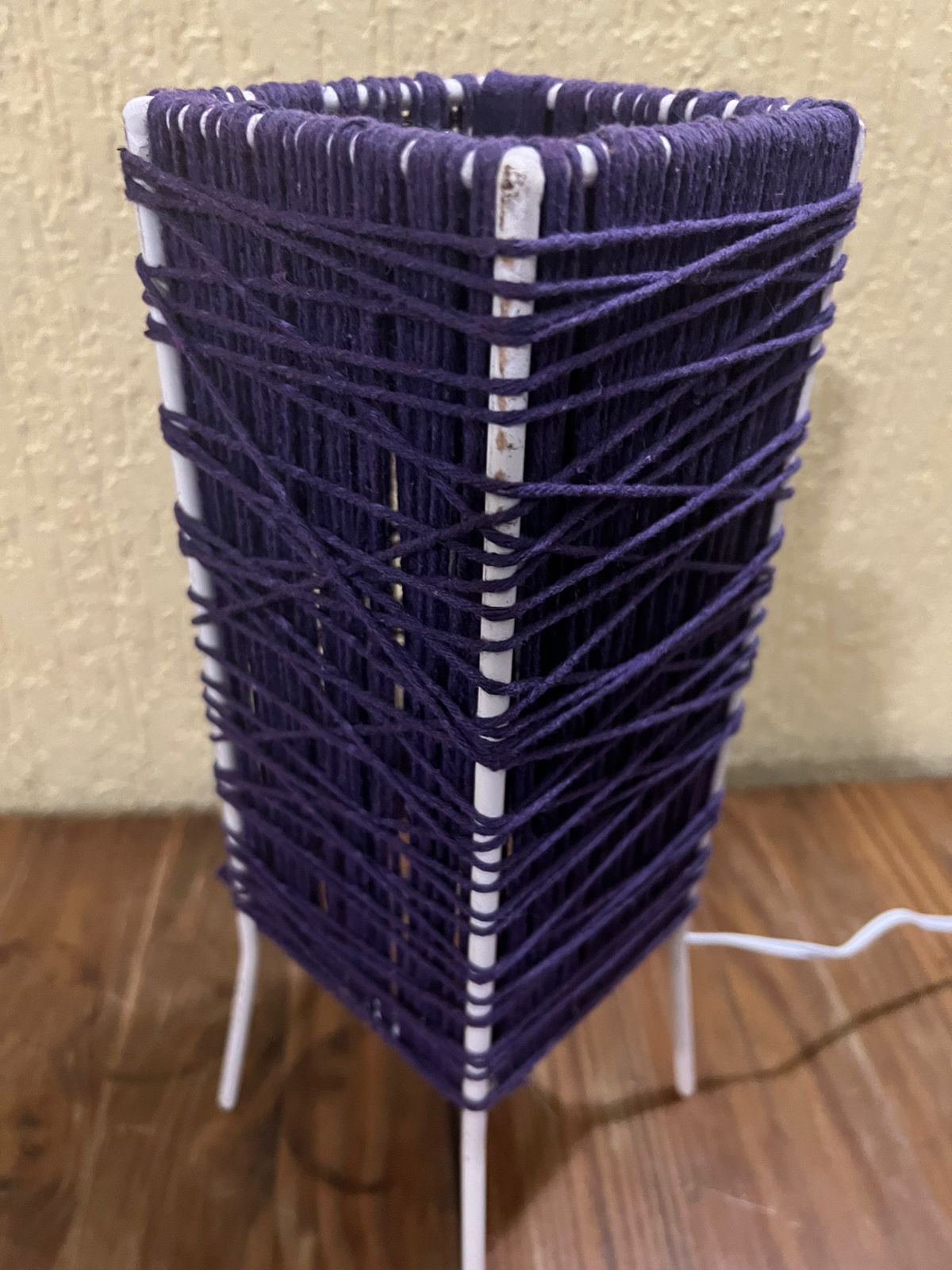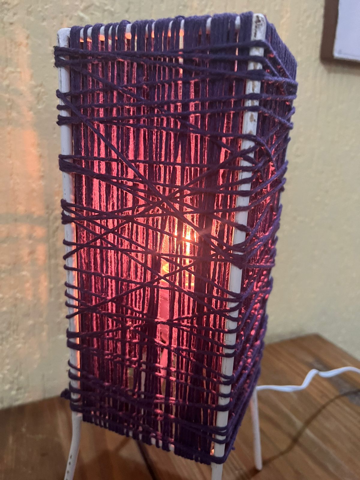 Luminária de mesa com linha roxa.