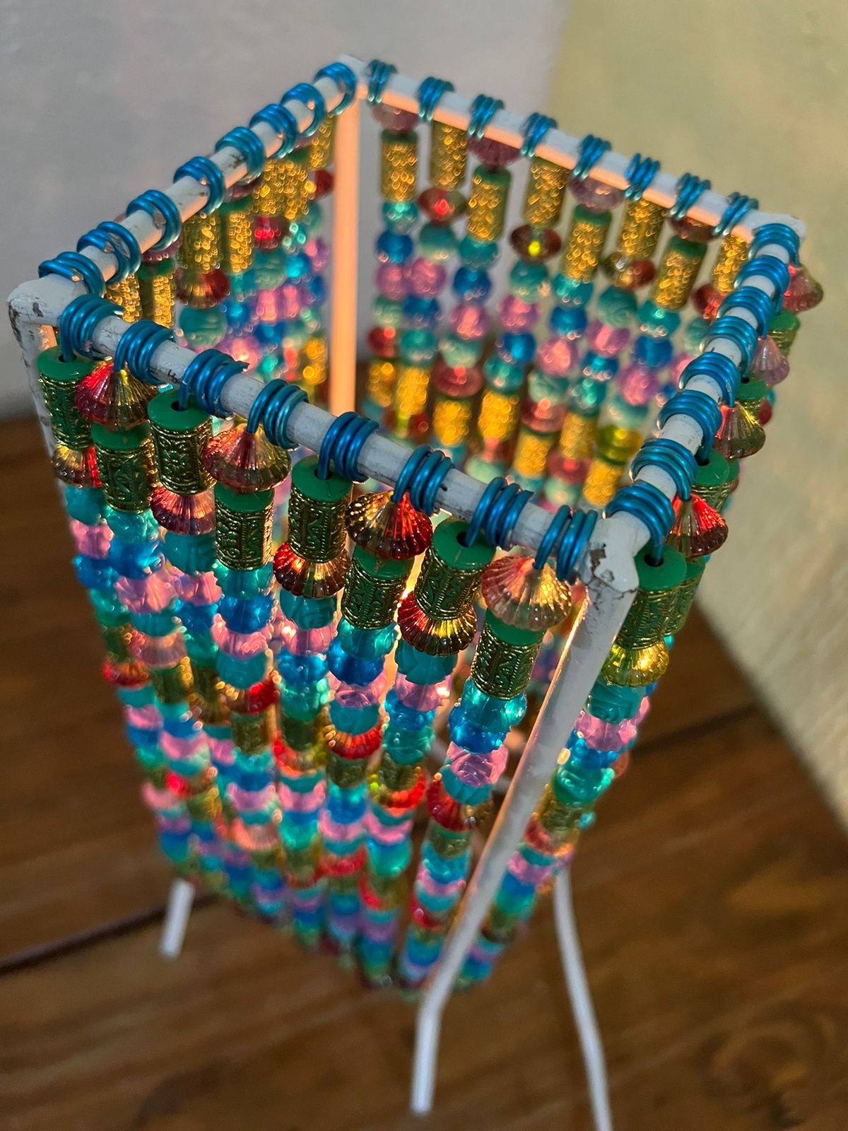Estrutura de ferro e aço. Mistura de peças novas e usadas.Possui miçangas reutilizadas.