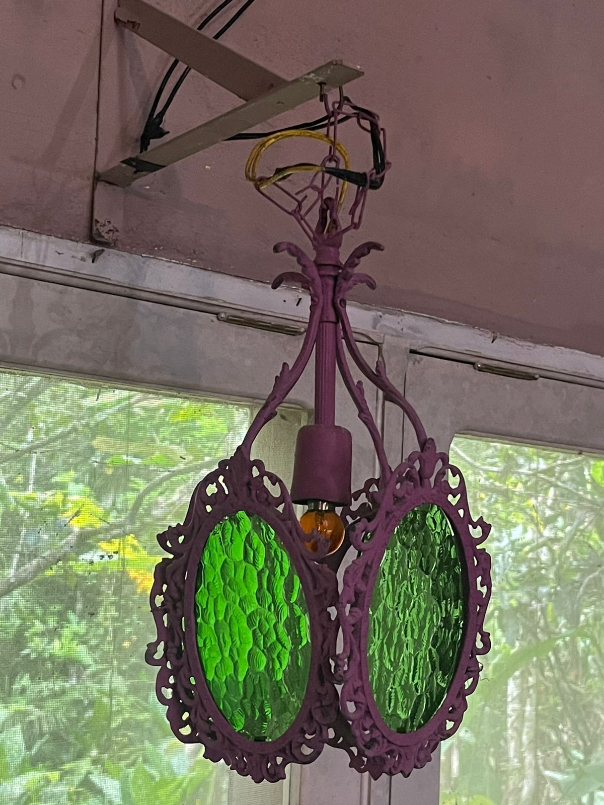Lustre de ferro, na cor rosa, possui 4 placas pequena de vidro na cor verde, que ficam ao redor do bocal.