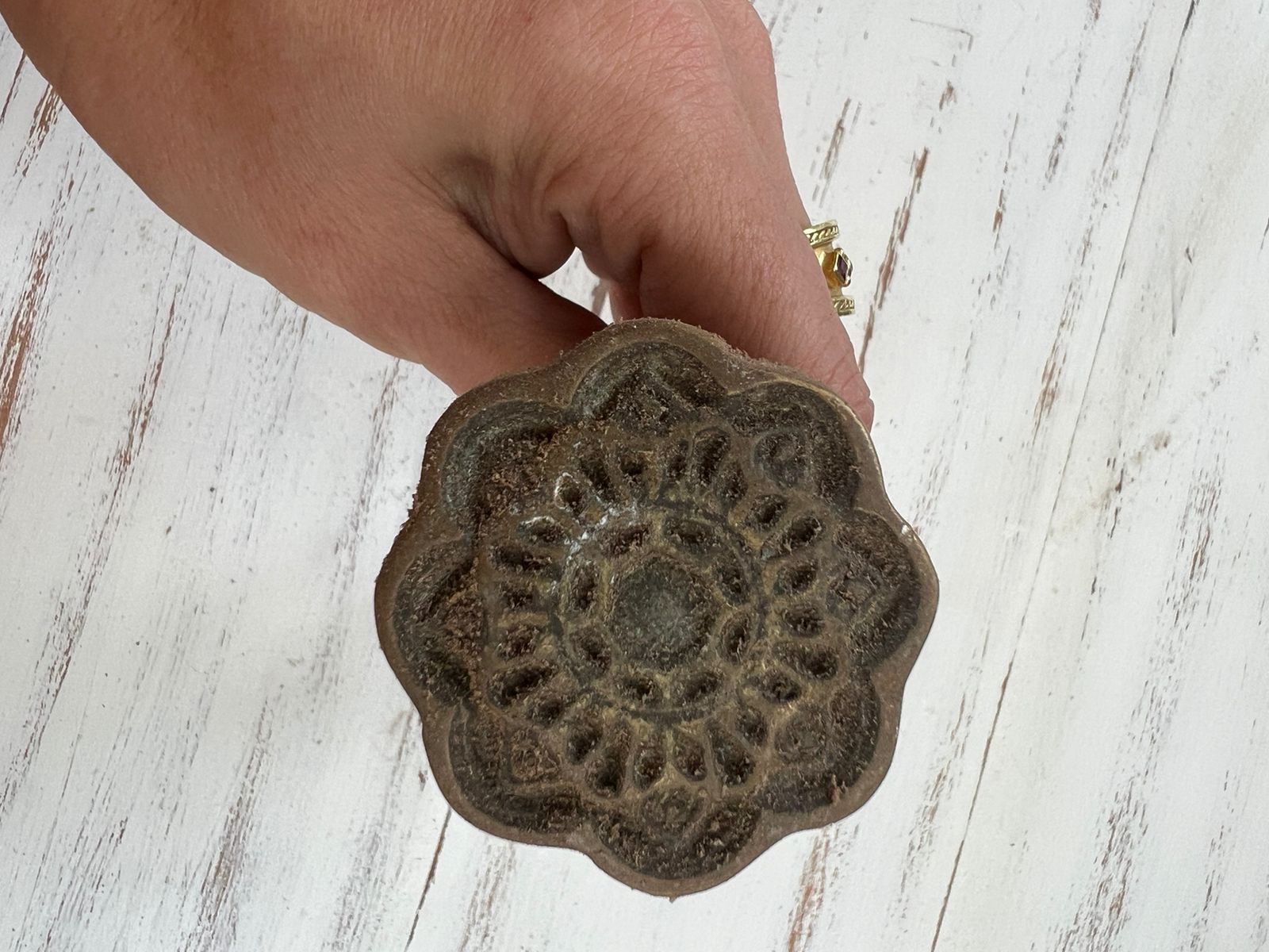 Retirado de uma porta antiga, podendo ser reutilizadas. Possui detalhes de flor.