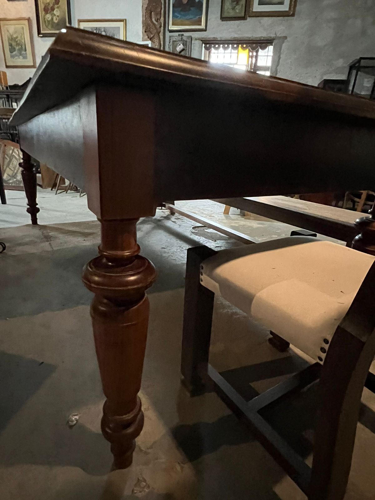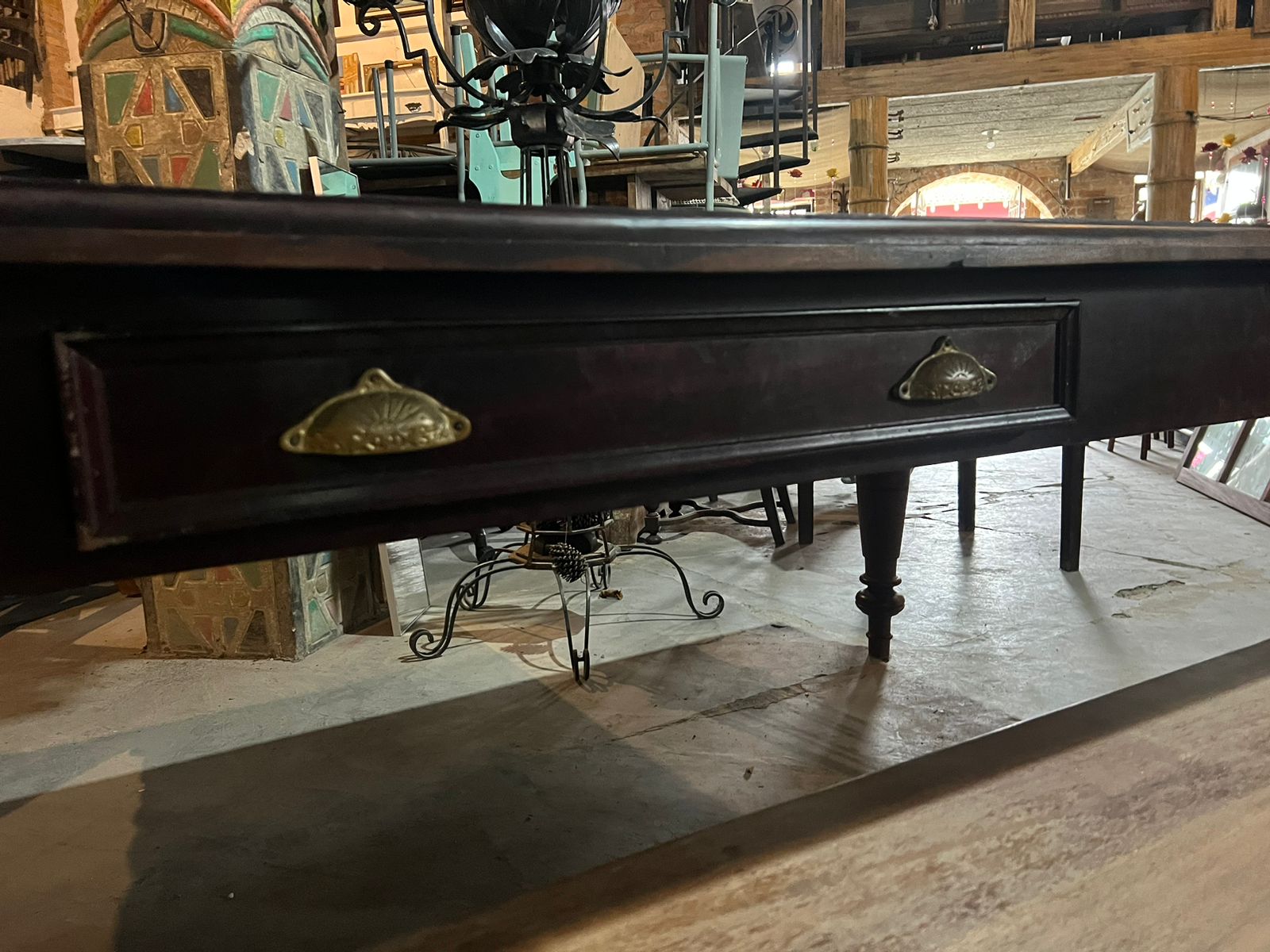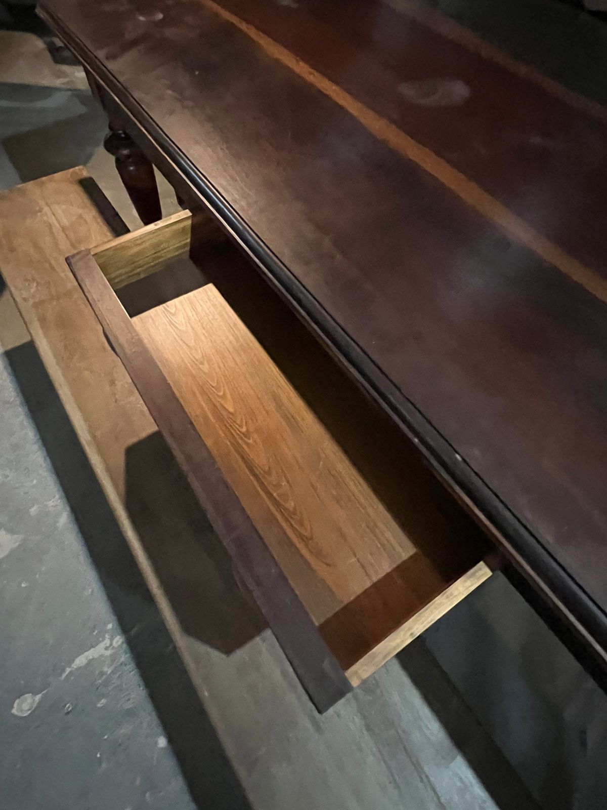 Feita de madeira maciça, possui os pés torneados, 2 bancos e gaveta grande.