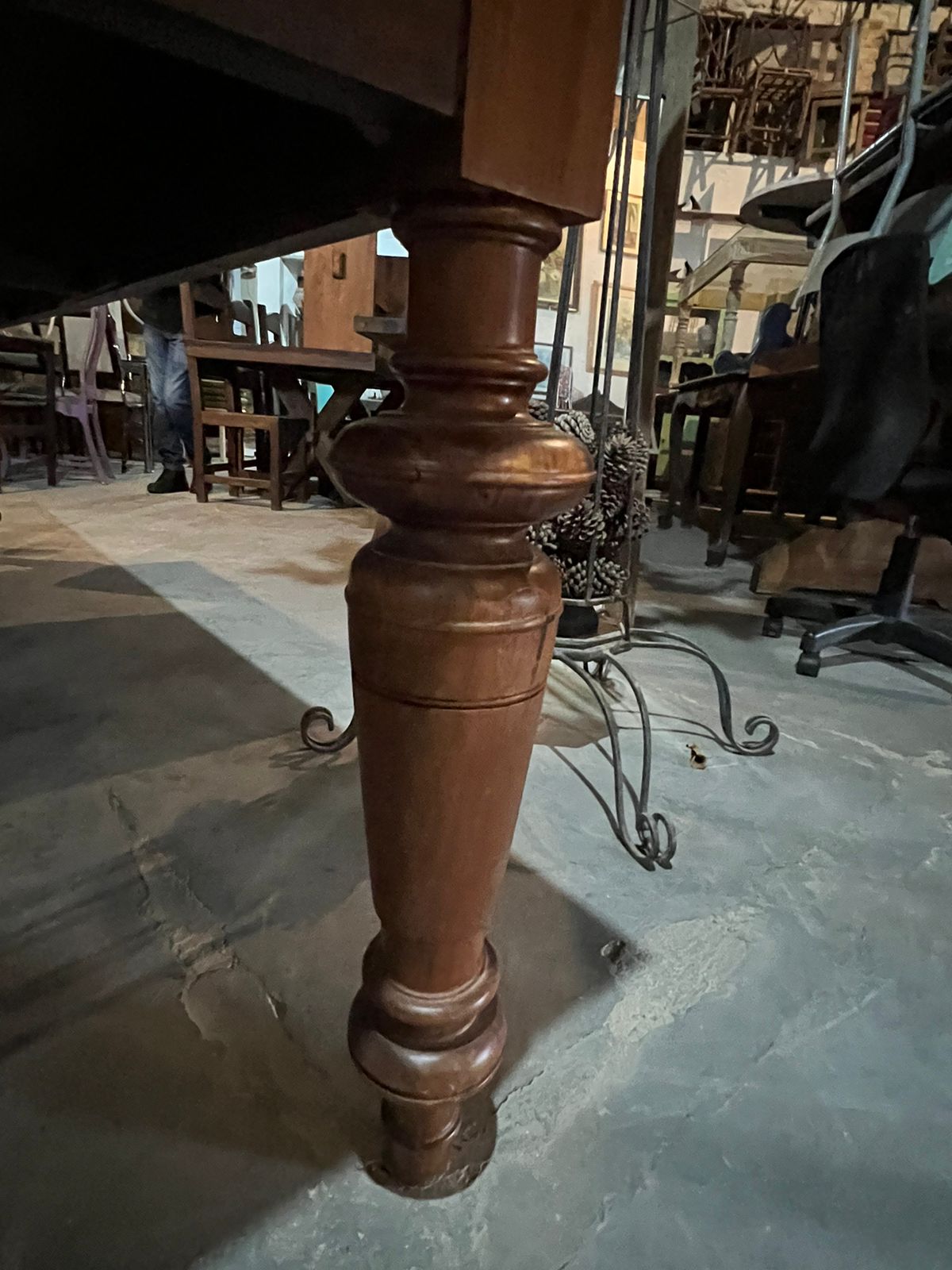 Feita de madeira maciça, possui os pés torneados, 2 bancos e gaveta grande.