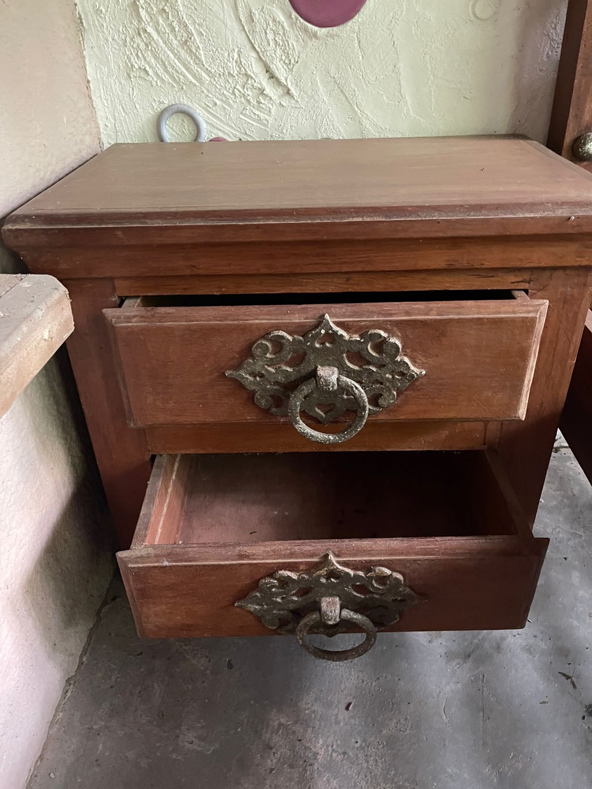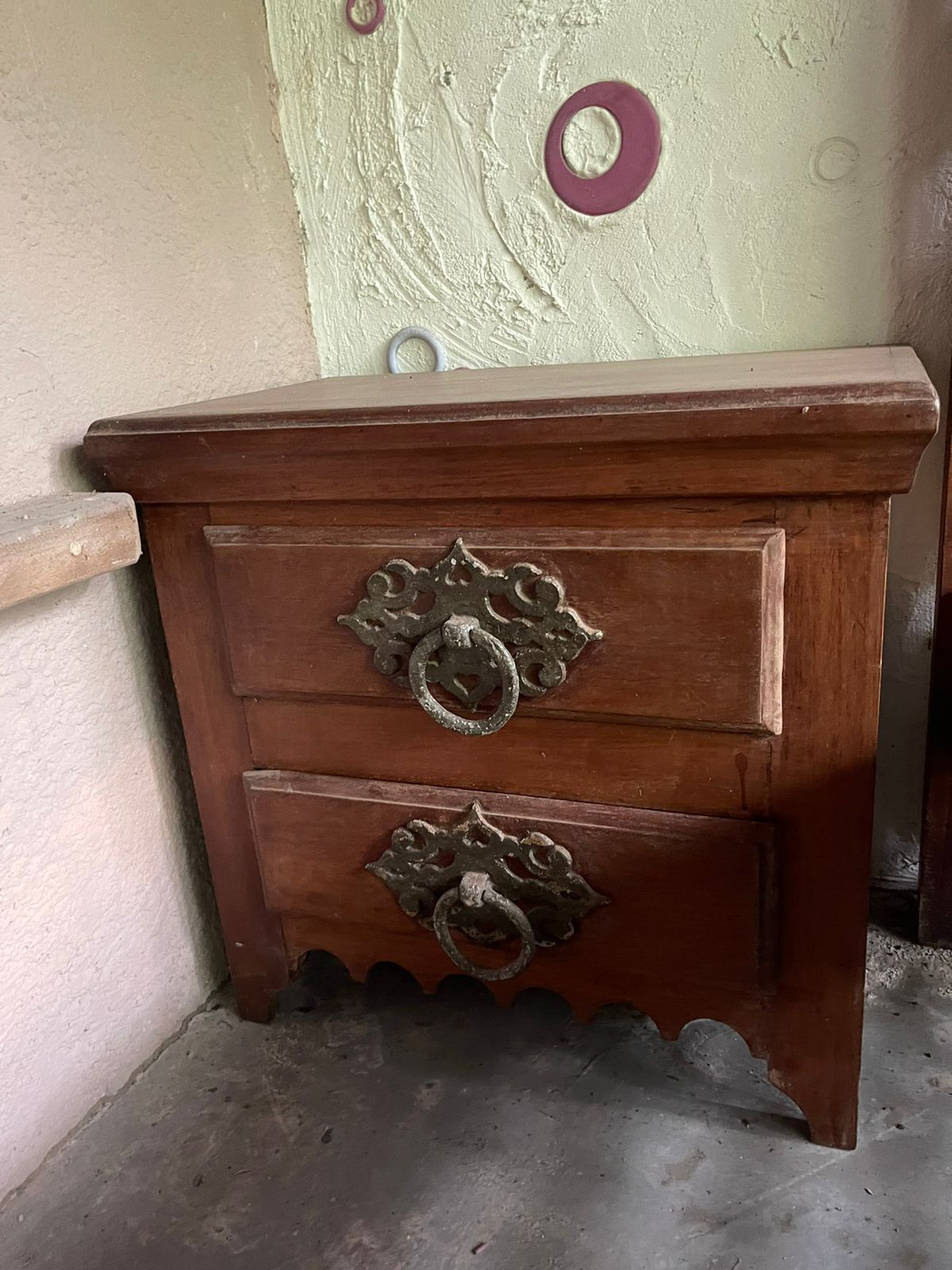 De madeira maciça, bem conservada. Possui 2 gavetas com puxadores em argola.